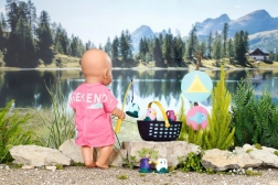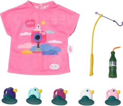 „Im Meer gibt es viel mehr Fische…“ Aber BABY born fängt lieber niedliche Entchen. Während sie gemütlich in einem rosa Liegestuhl mit buntem Muster sitzt, versucht sie, eines der fünf Entlein mit dem Haken der Angelrute zu erwischen. Zwischendurch nippt sie an der Limonade, die auf dem gelben Tischchen neben dem Liegestuhl steht. Wenn sie alle Entchen herausgefischt und im blauen Korb verstaut hat, setzt sie sie wieder in den Teich zurück und das lustige Spiel kann von vorne beginnen. Für dieses Angelspiel trägt BABY born ein lässiges, langes rosa T-Shirt mit süßem Print.