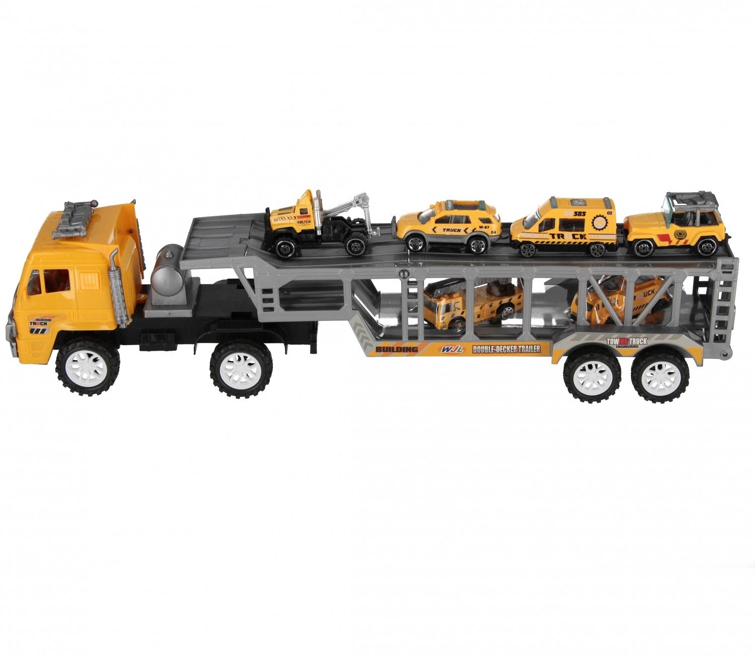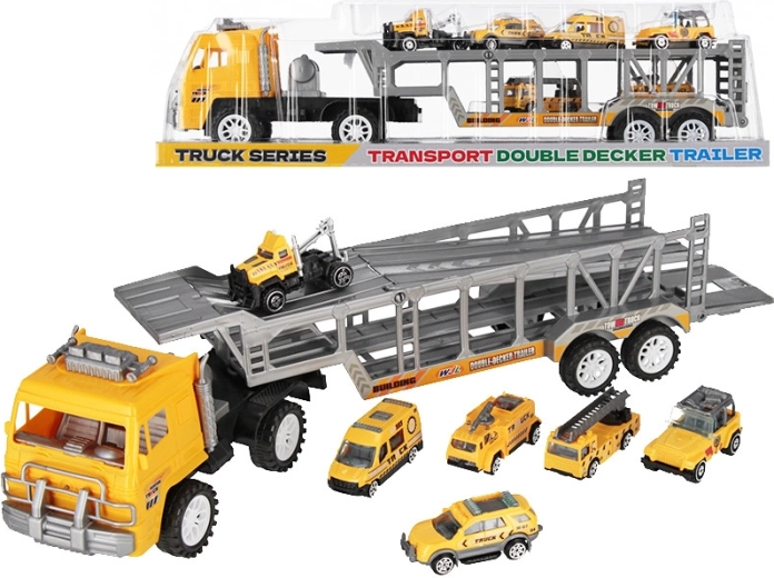 Der große Sattelschlepper mit Auflieger ermöglicht bequemes Beladen und den Transport mehrerer Autos gleichzeitig. Die offene Konstruktion sorgt für bessere Übersicht und erleichtert die Handhabung.