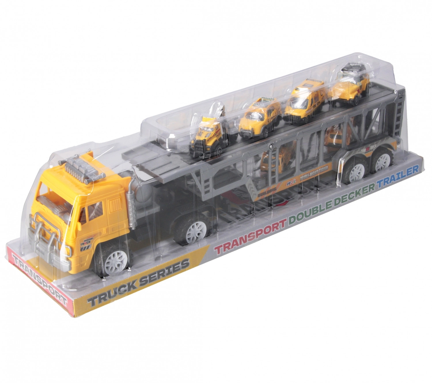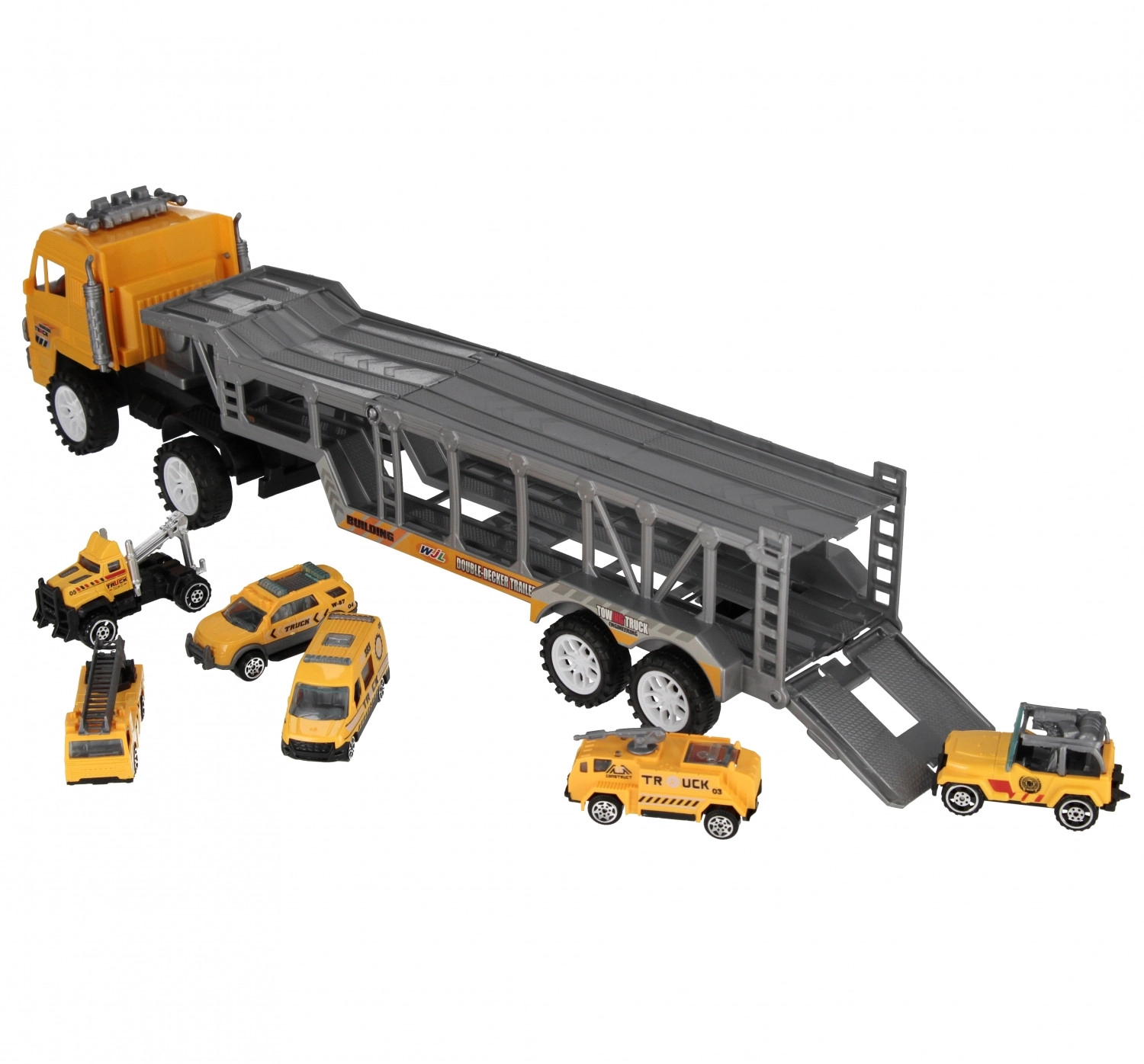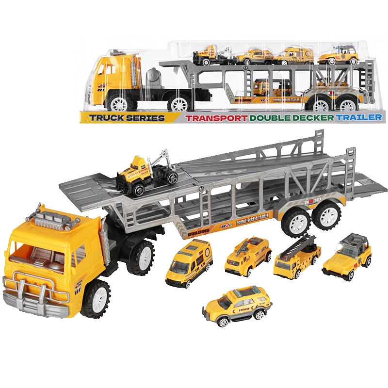 Dieser robuste Autotransporter für Kinder ermöglicht den Transport kleiner Autos und das Erstellen eigener Verkehrs- und Bauszenarien. Der zweistöckige Auflieger mit aufklappbarer Rampe erleichtert das Be- und Entladen, während die kompakten Maße ideal für das Spielen zu Hause sind.
