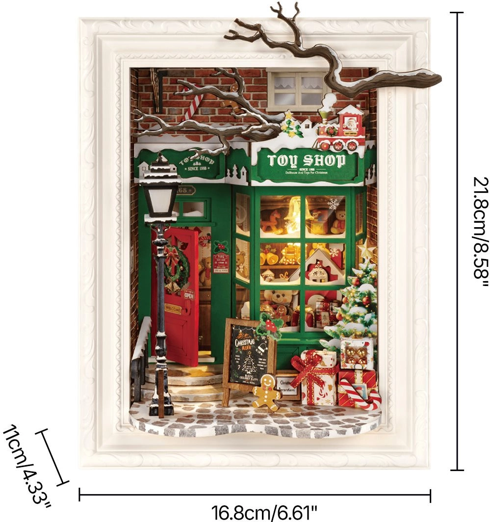 Treten Sie ein in eine Welt, in der Träume wahr werden. Das Miniatur-Spielwarengeschäft von Rolife besticht durch realistische Elemente – von der leuchtenden Laterne und den roten Türen über den Weihnachtsbaum mit Schneekappe bis hin zu den Wänden aus roten Ziegeln und den Geschenken im Schaufenster. Dank der LED-Beleuchtung erhält das Modell eine einzigartige Atmosphäre und wird zu einer auffälligen Dekoration.
