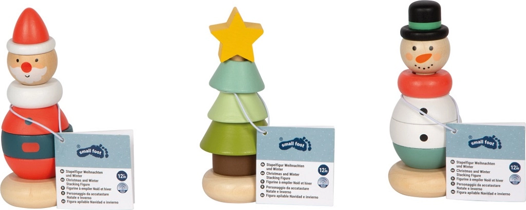 Entdecken Sie fröhliches weihnachtliches Stapeln! Die Holzfiguren in Form von WEIHNACHTSMANN, Weihnachtsbaum mit goldenem Stern und lächelndem Schneemann bestehen aus mehreren bunten Ringen und Teilen, die auf einen stabilen Stab gesteckt werden. Das Spiel motiviert Kinder intuitiv, Griff, Genauigkeit und Konzentration zu trainieren – und sorgt gleichzeitig für eine schöne festliche Atmosphäre im Kinderzimmer und Wohnzimmer.