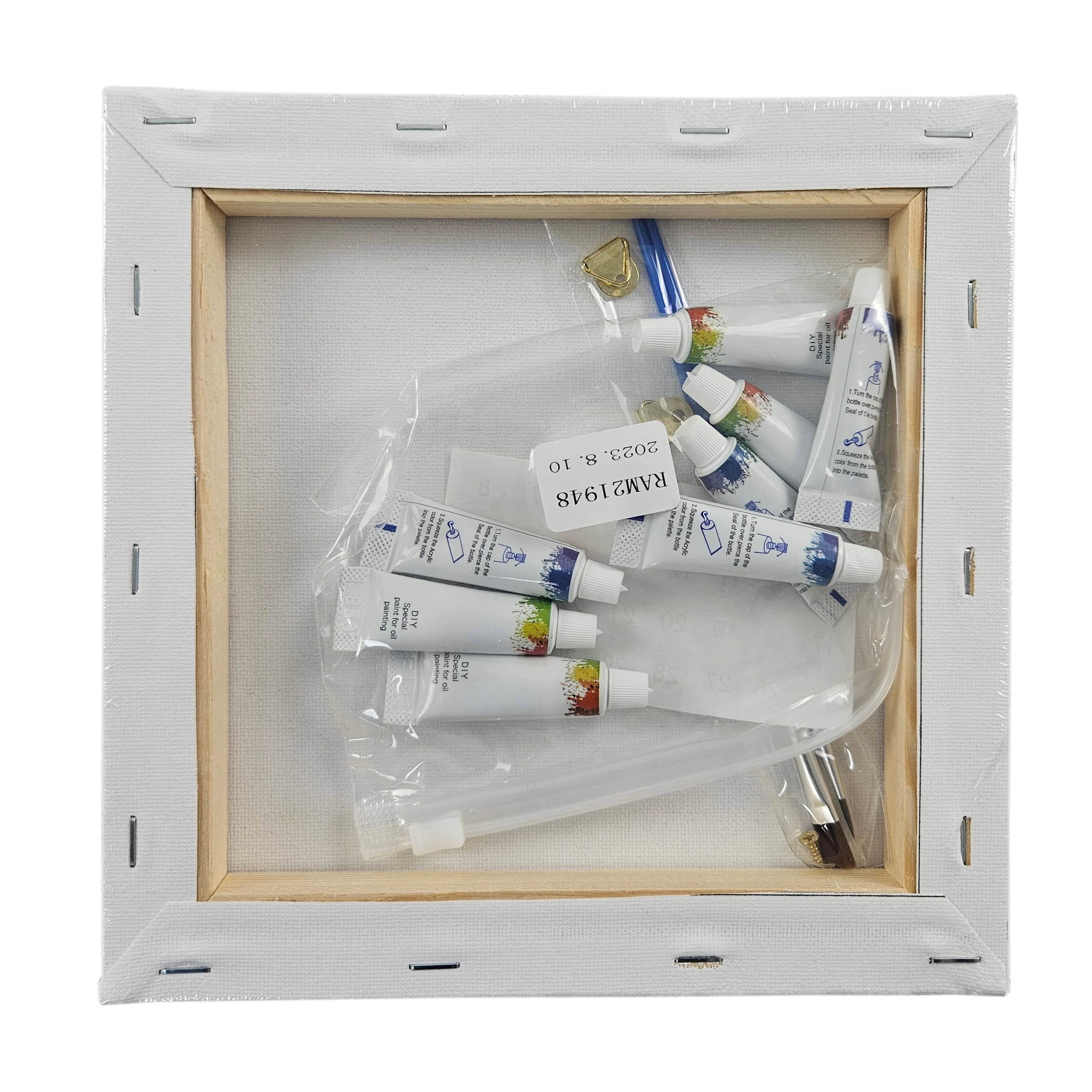 Im Paket finden Sie die aufgespannte Leinwand, Pinsel und ein Set Acrylfarben – nach dem Auspacken können Sie direkt loslegen und das Bild nach Fertigstellung aufhängen.