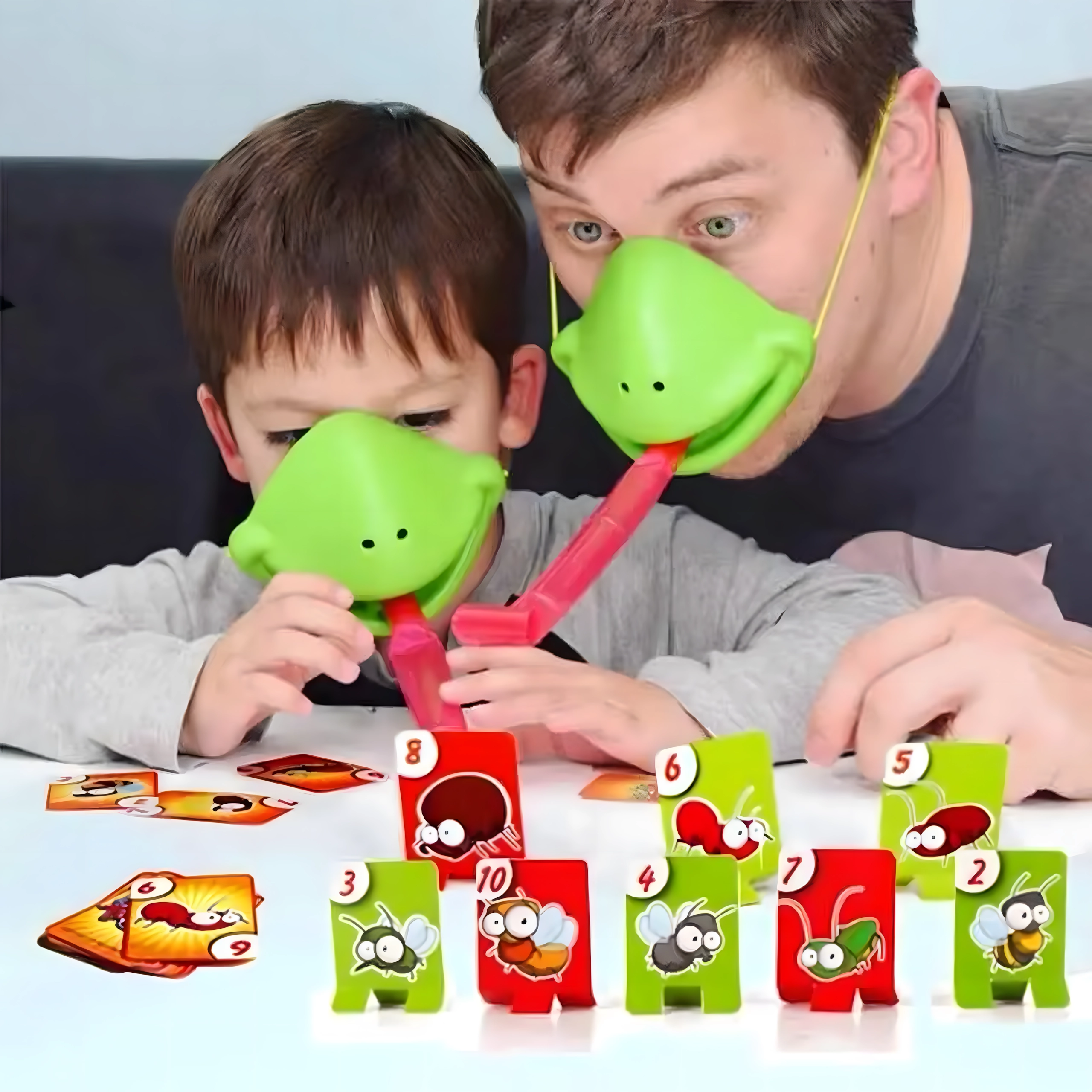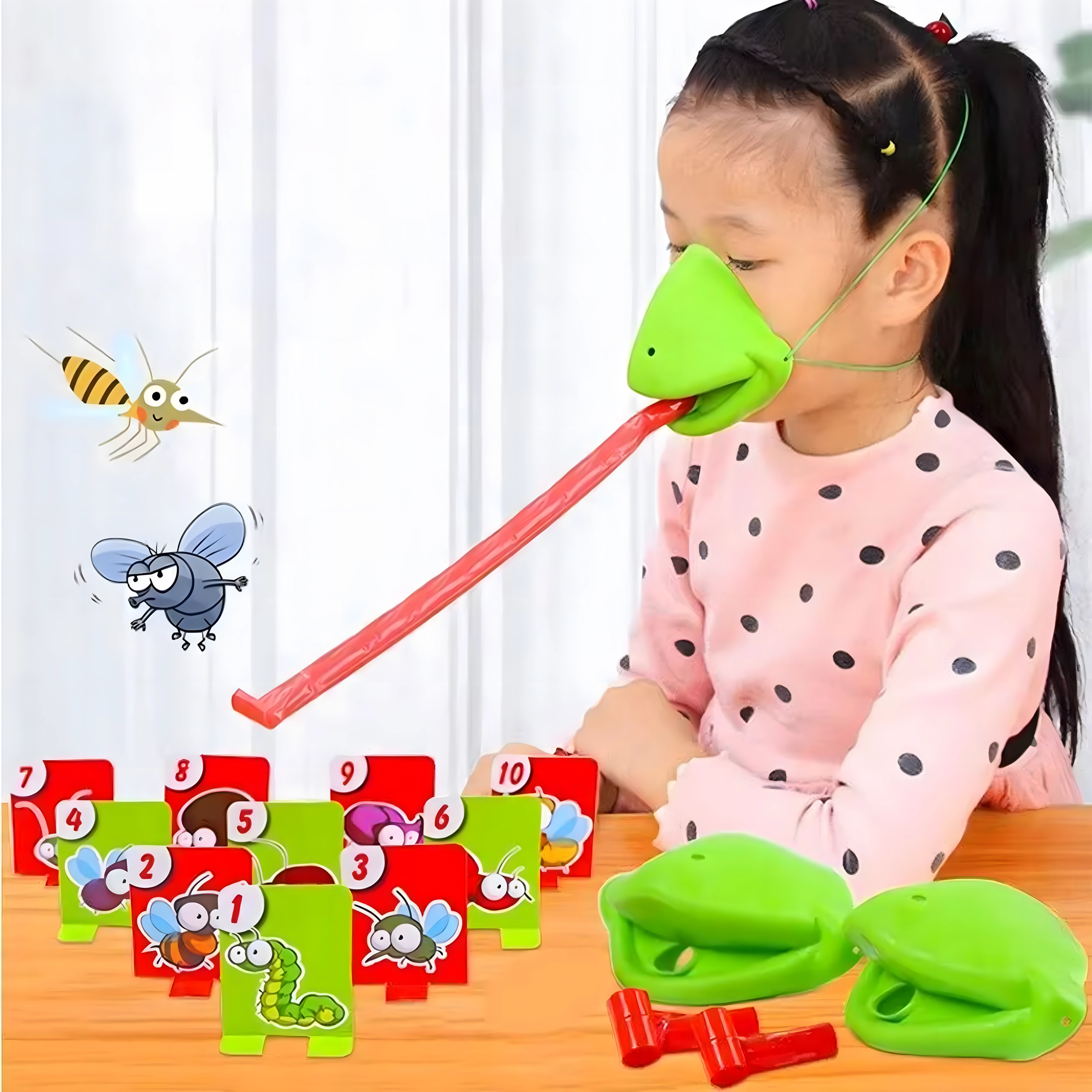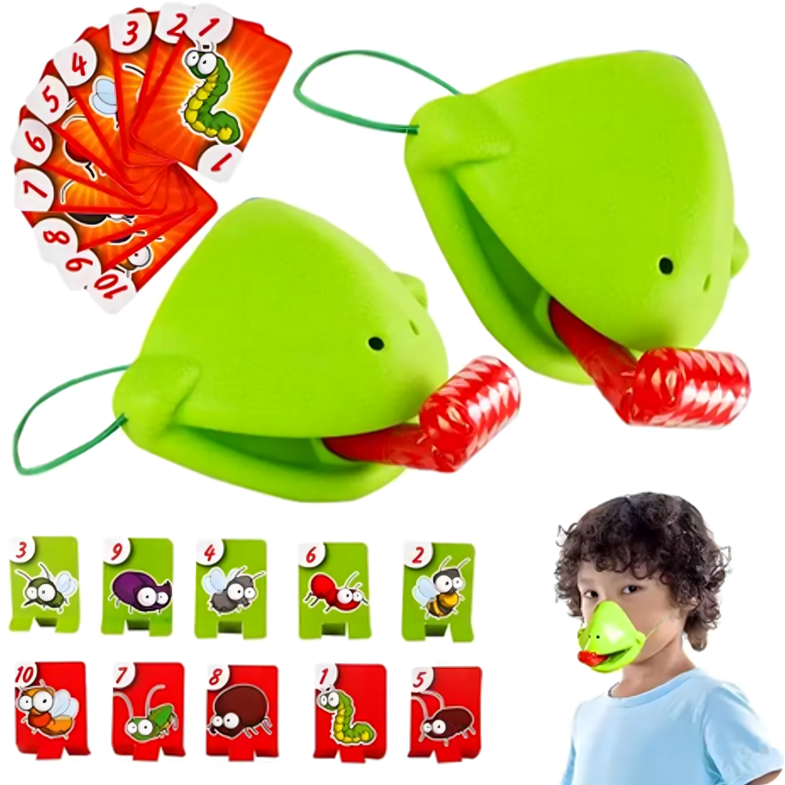 Verwandelt euch in Frösche und geht auf Käferjagd! Maske aufsetzen, zielen und mit der Zunge auf die Zielkarten schießen – wer das richtige Bild oder die richtige Zahl am schnellsten erwischt, sammelt Punkte. Das Spiel ist leicht zu verstehen, in wenigen Augenblicken startklar und begeistert kleine wie große Spieler.