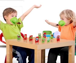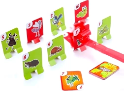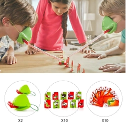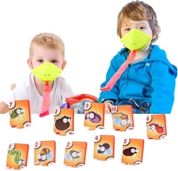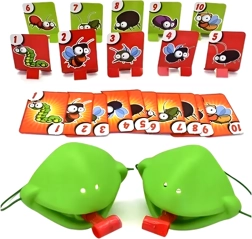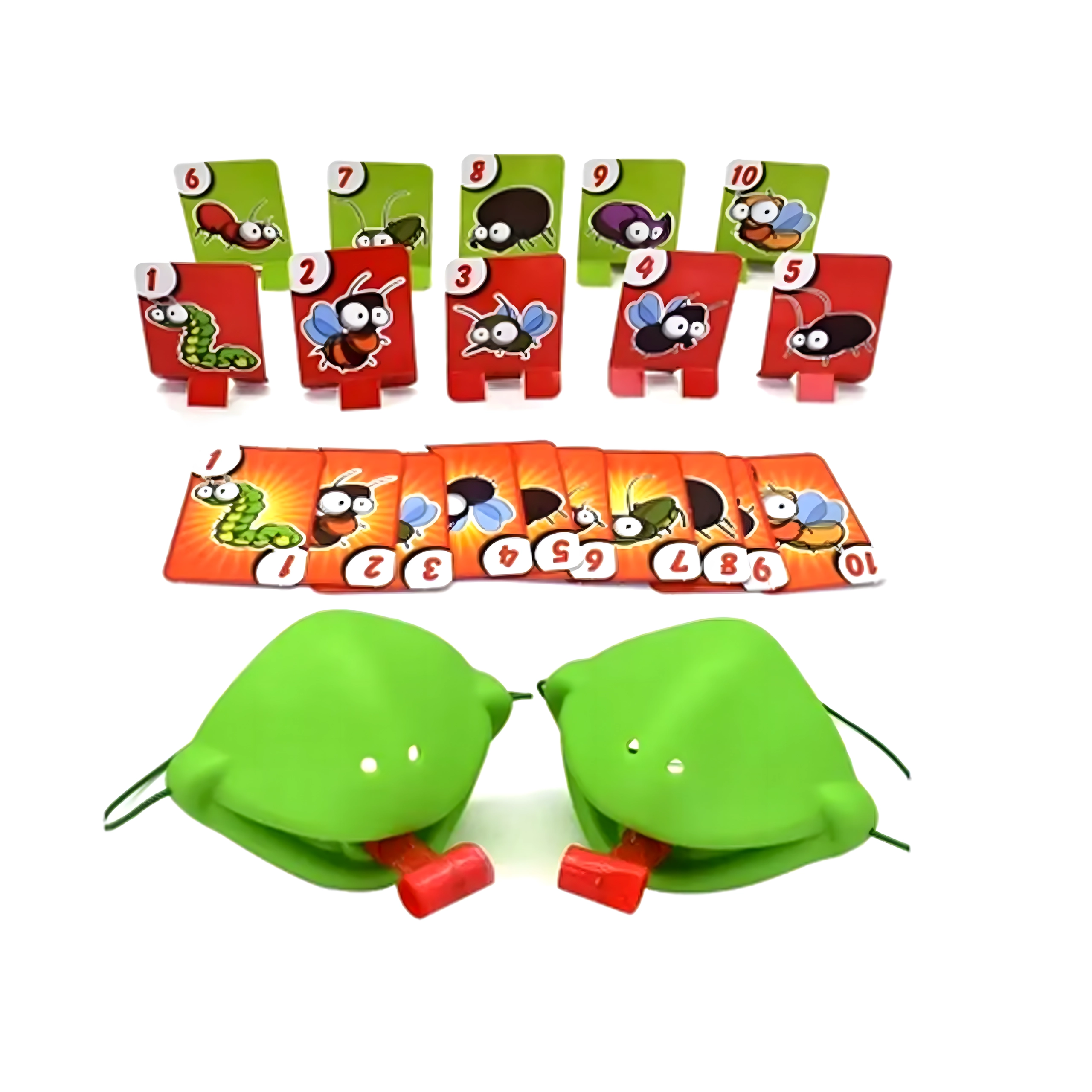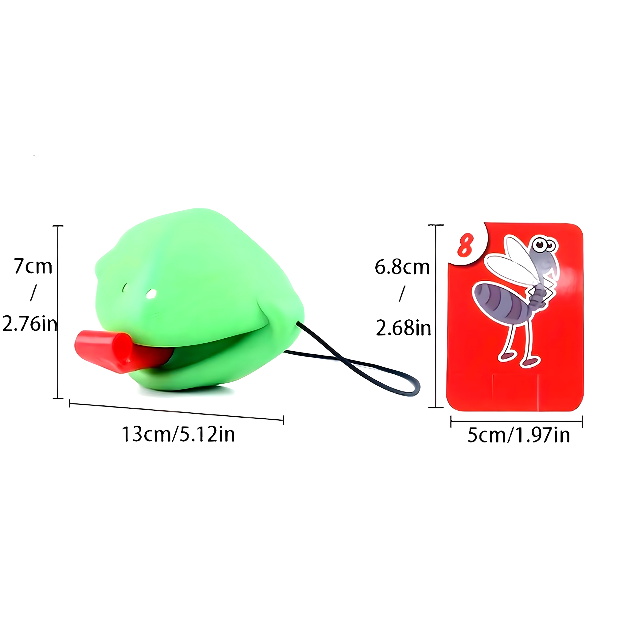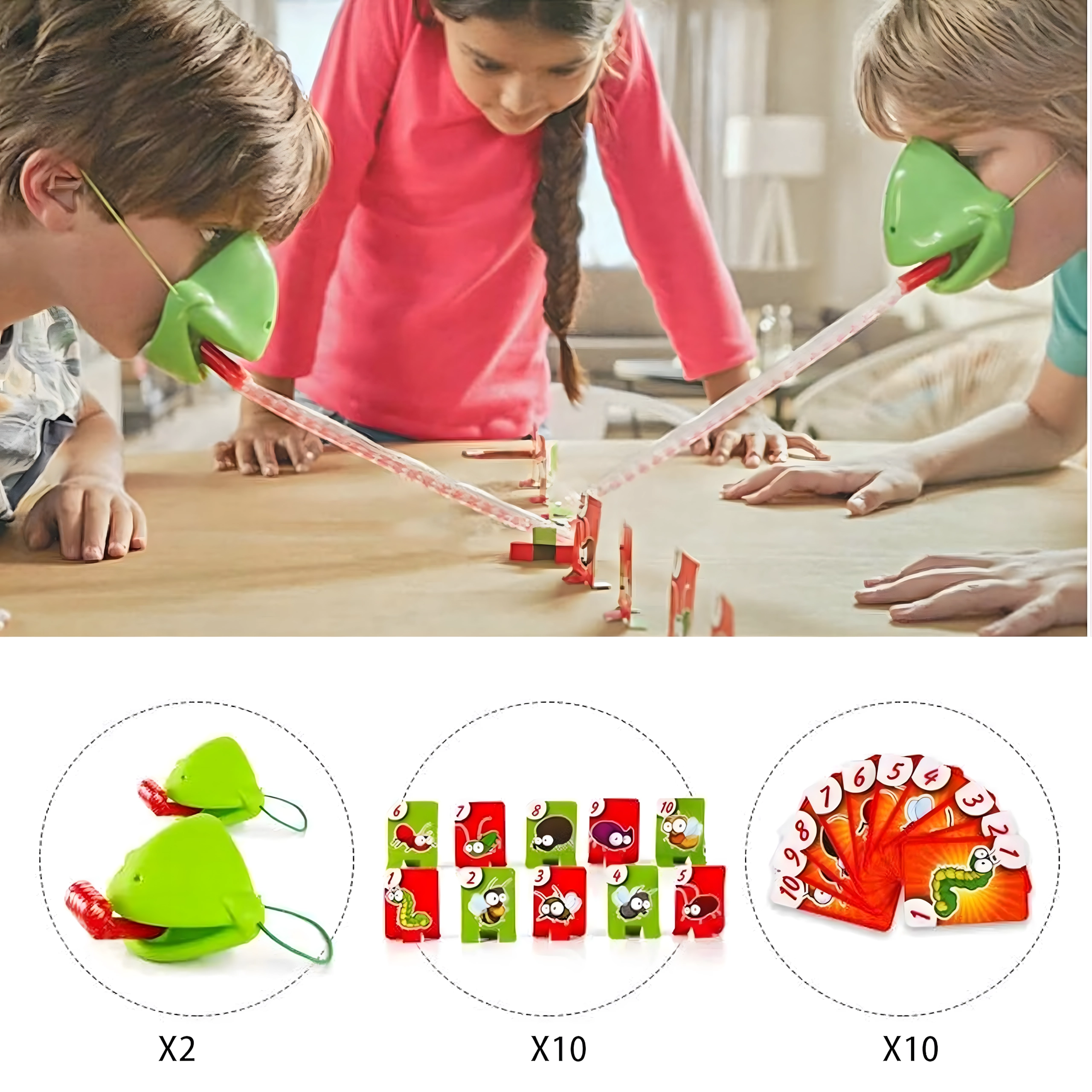 Verwandelt euch in Frösche und geht auf Käferjagd! Maske aufsetzen, zielen und mit der Zunge auf die Zielkarten schießen – wer das richtige Bild oder die richtige Zahl am schnellsten erwischt, sammelt Punkte. Das Spiel ist leicht zu verstehen, in wenigen Augenblicken startklar und begeistert kleine wie große Spieler.