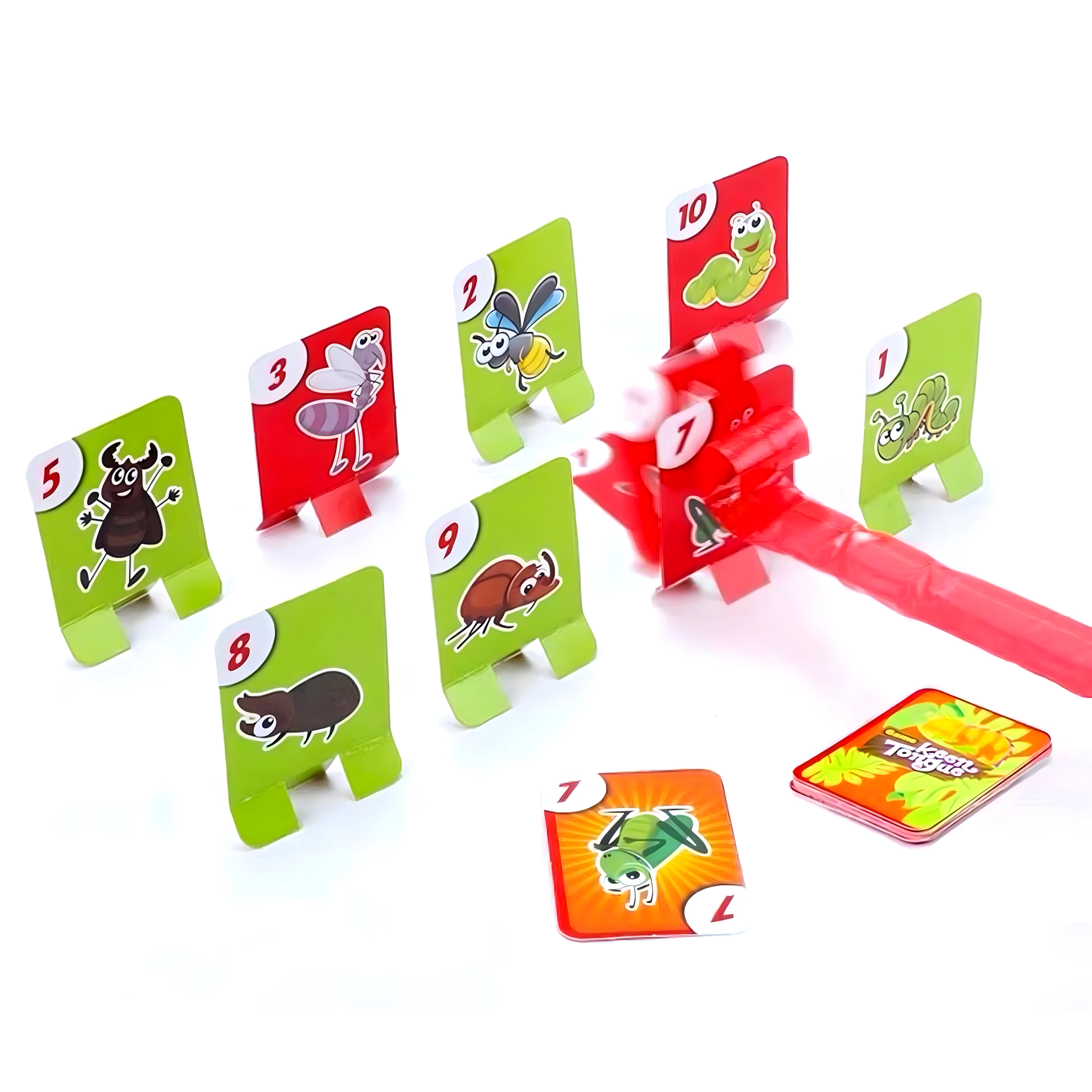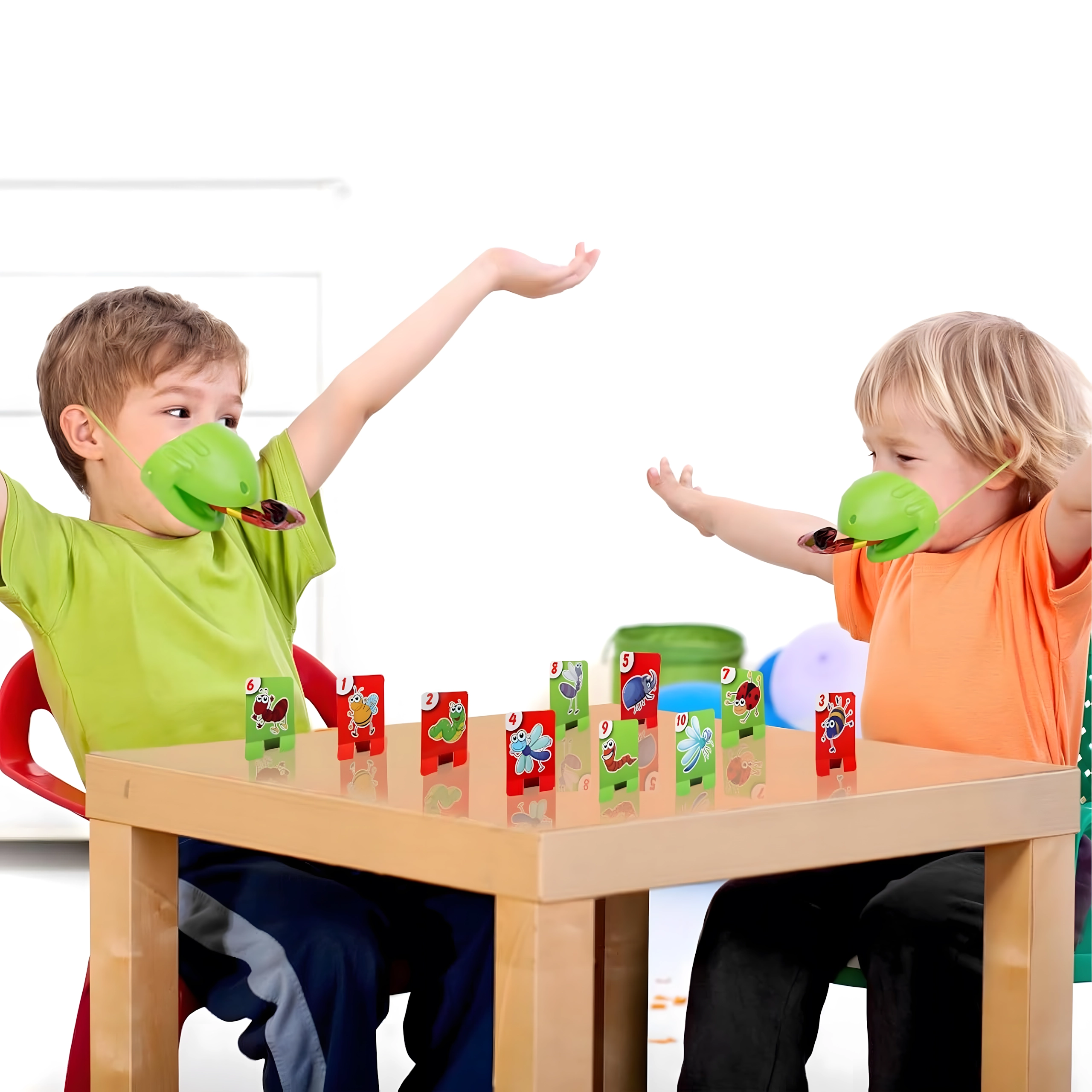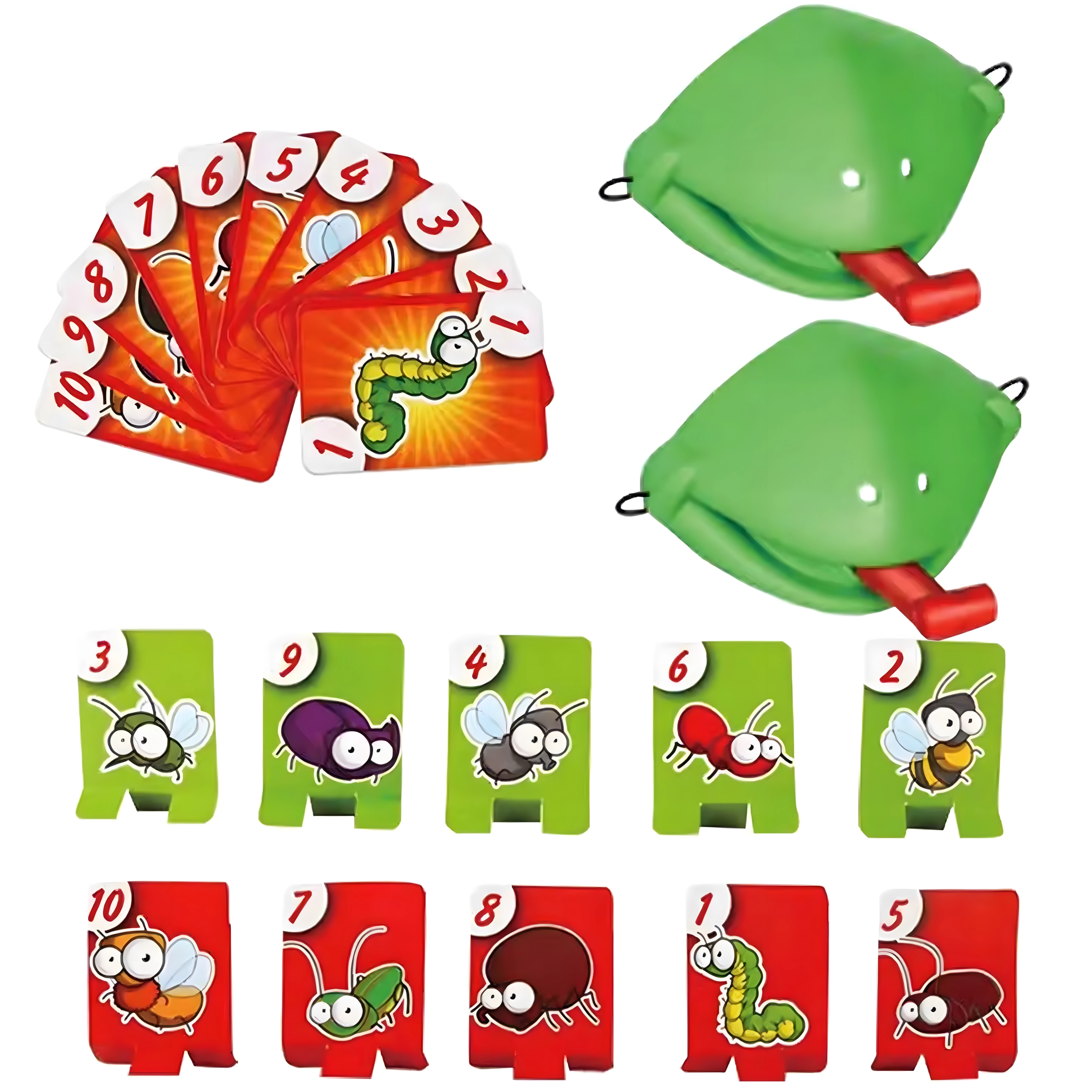 Dank verstellbarer, elastischer Bänder sitzen die Masken sicher, die flexible Zunge sorgt für actionreichen und sicheren Spielspaß und die bunten Insektenkarten fördern Zahlenerkennung, Aufmerksamkeit und Hand-Auge-Koordination. Perfekt für Familienabende, Kindergeburtstage und freundschaftliche Duelle.