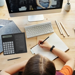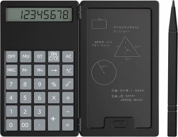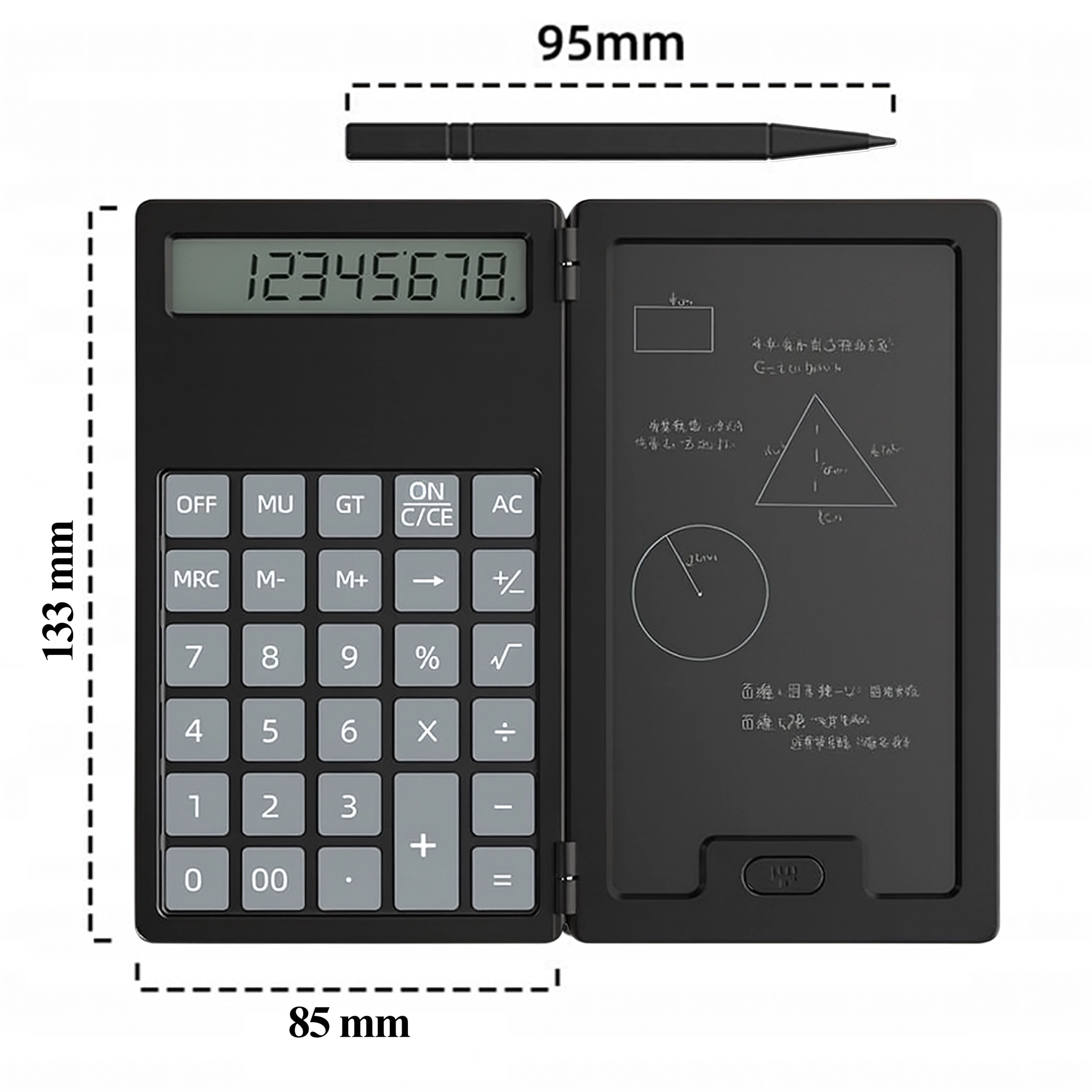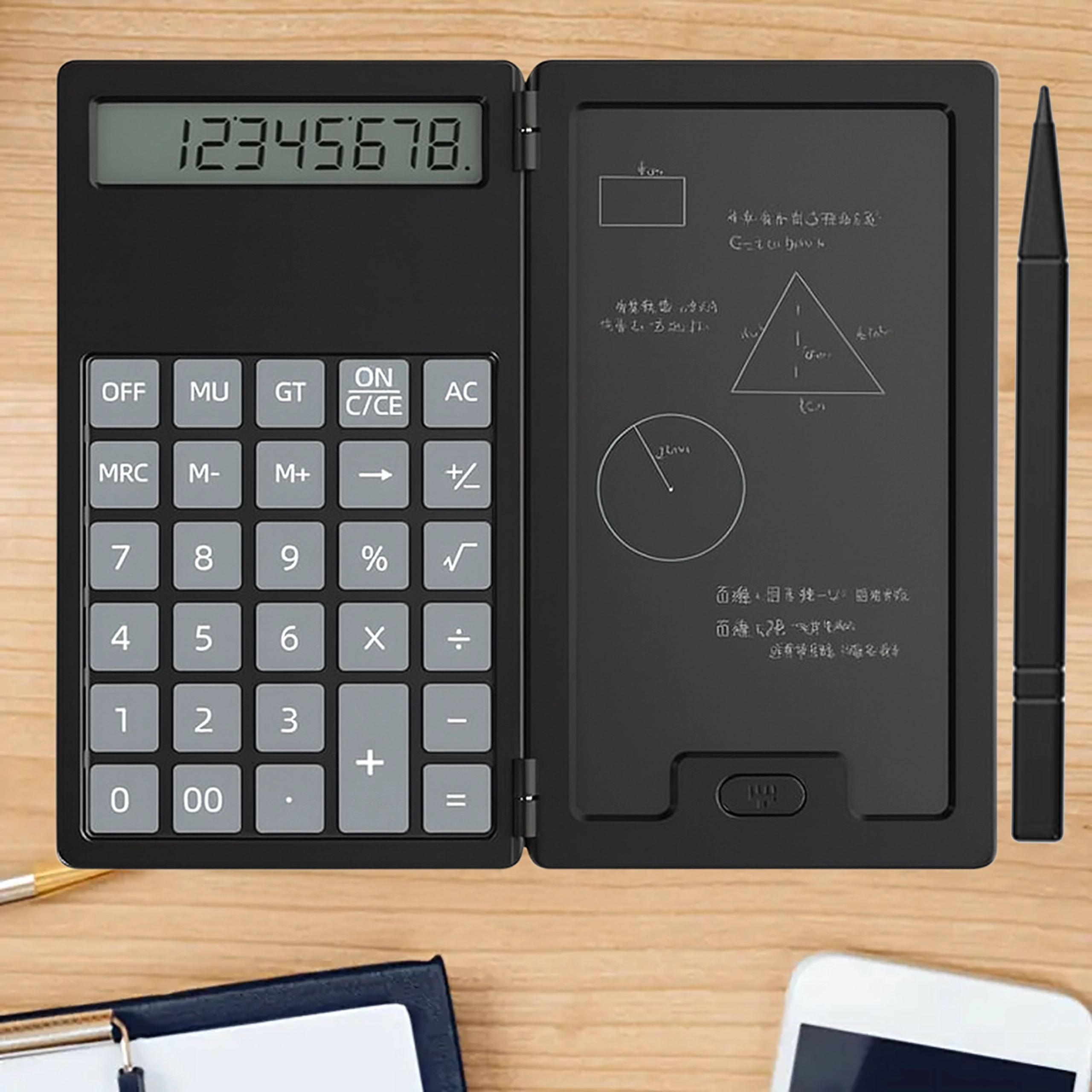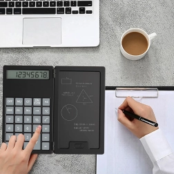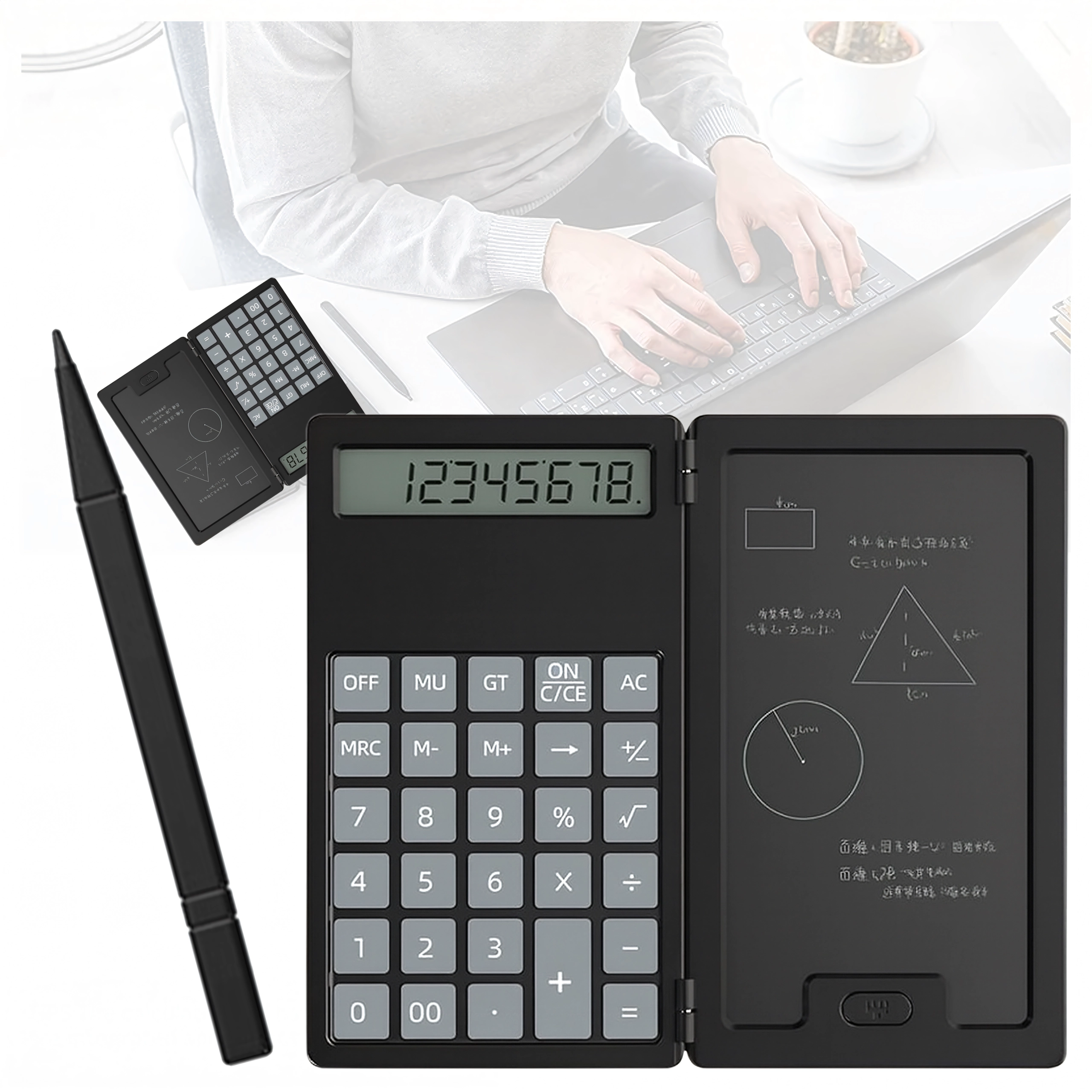 Dieser smarte Rechner mit klappbarem Gehäuse kombiniert klassisches Rechnen mit einer praktischen LCD-Schreibtafel für Notizen. Dank des leichten und schlanken Designs passt er problemlos in Tasche oder Hosentasche – so haben Sie ihn stets griffbereit für schnelle Berechnungen und Notizen.