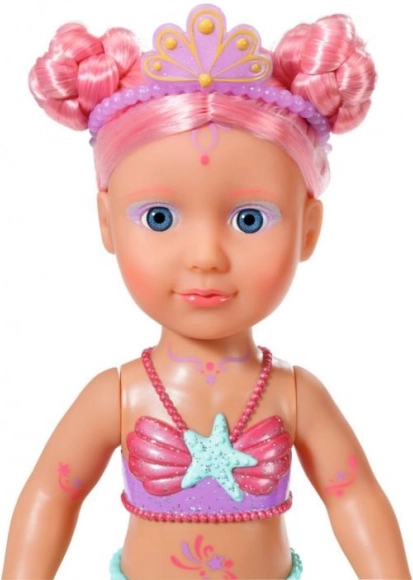 BABY born Little Meerjungfrau Prinzessin ist eine unwiderstehliche Puppe mit langen rosa Haaren, die mit einem lila Haarband verziert sind. Die Flosse der Puppe ist wunderschön bunt, glitzernd und bewegt sich bei Kontakt mit Wasser, was eine magische Atmosphäre schafft. Sie trägt einen Badeanzug mit Muscheldesign, der perfekt zur Schwanzflosse passt.