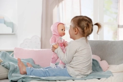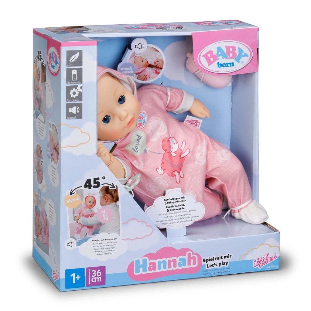 Entdecke den Zauber von Fürsorgespielen mit der Puppe BABY born Hannah – Komm, wir spielen! Dank des weichen Körperchens liegt sie angenehm in der Hand, lässt sich wunderbar im Arm halten und lädt zum Kuscheln ein. Kinder lieben die einfache Interaktion – die Puppe gibt süße Babylaute von sich, beim Füttern mit dem Fläschchen erklingen niedliche Trinkgeräusche und beim Einschlafen schnurrt sie leise und schließt die Augen.