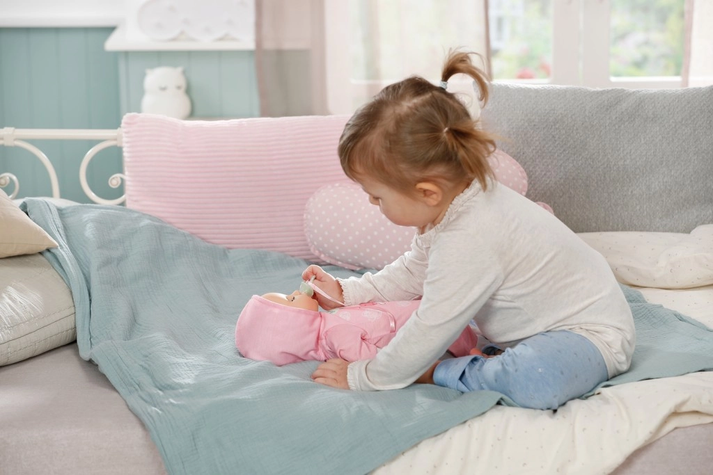 Beim Einschlafen summt die Puppe leise und schließt die Augen – so entwickeln Kinder leicht beruhigende Abendrituale.
