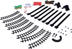 Das Set besteht aus einer schwarzen Lokomotive und drei verschiedenen Waggons: ein weißer Kohlewagen mit der Aufschrift Merry Christmas, ein roter Wagen mit Verzierungen und ein grüner Schlitten mit Santa.
