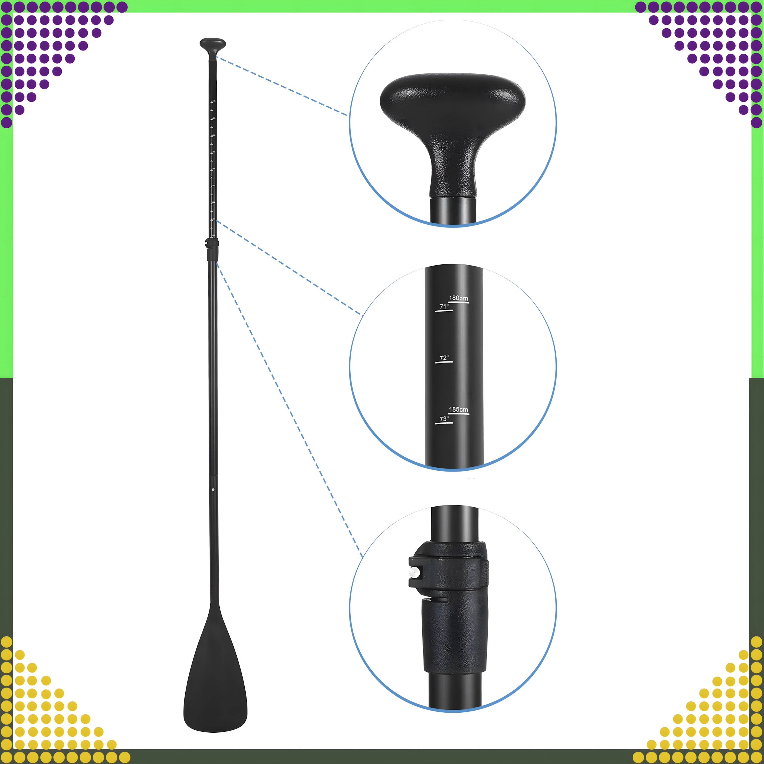Der stabile Aluminiumschaft und das ergonomisch geformte Nylonblatt sorgen für zuverlässigen Vortrieb und lange Lebensdauer. Schnelle Längenverstellung und ein T-Bar-Griff gewährleisten einen bequemen Halt sowie Kontrolle über Board oder Kajak. Geeignet für größere Kinder, Jugendliche und Erwachsene.