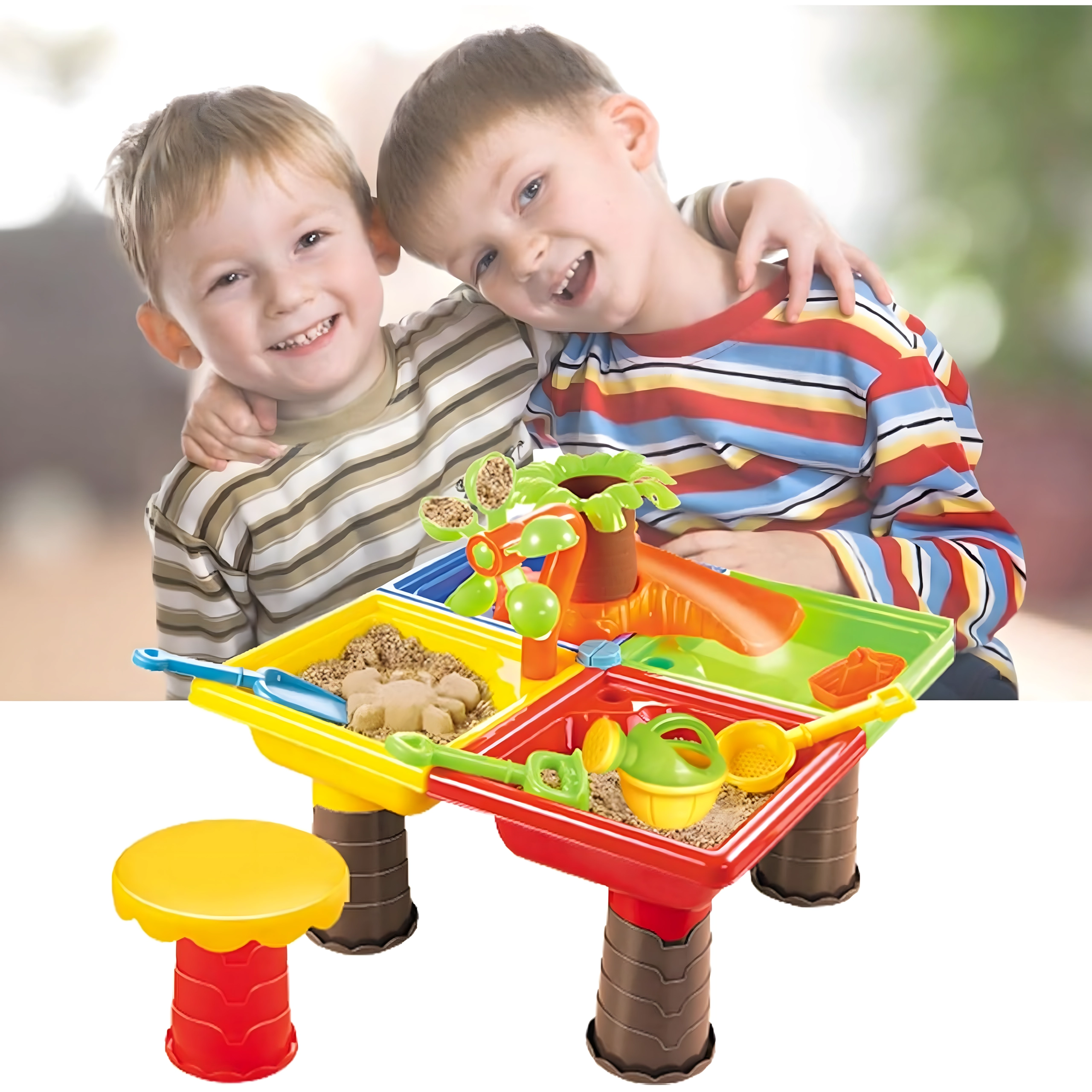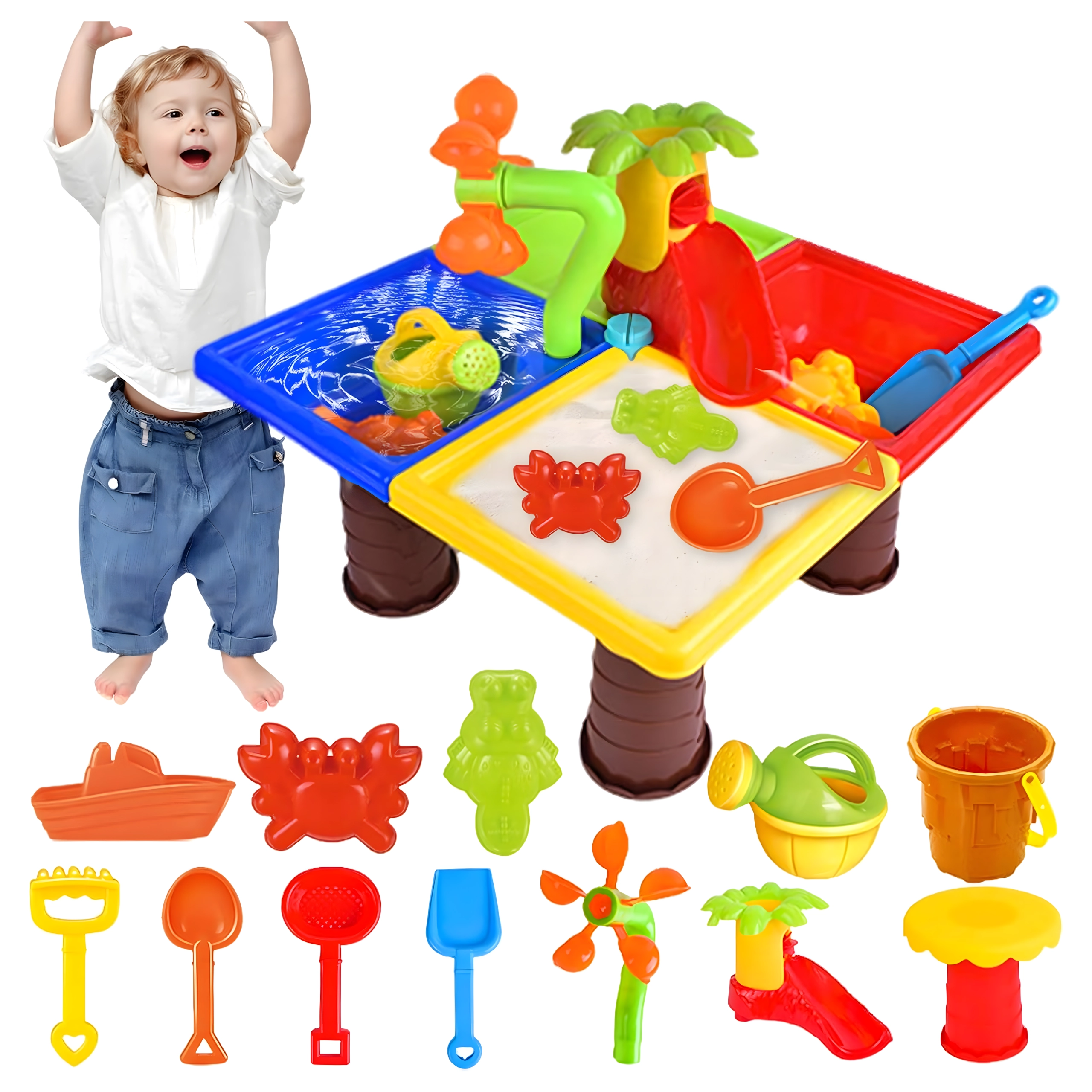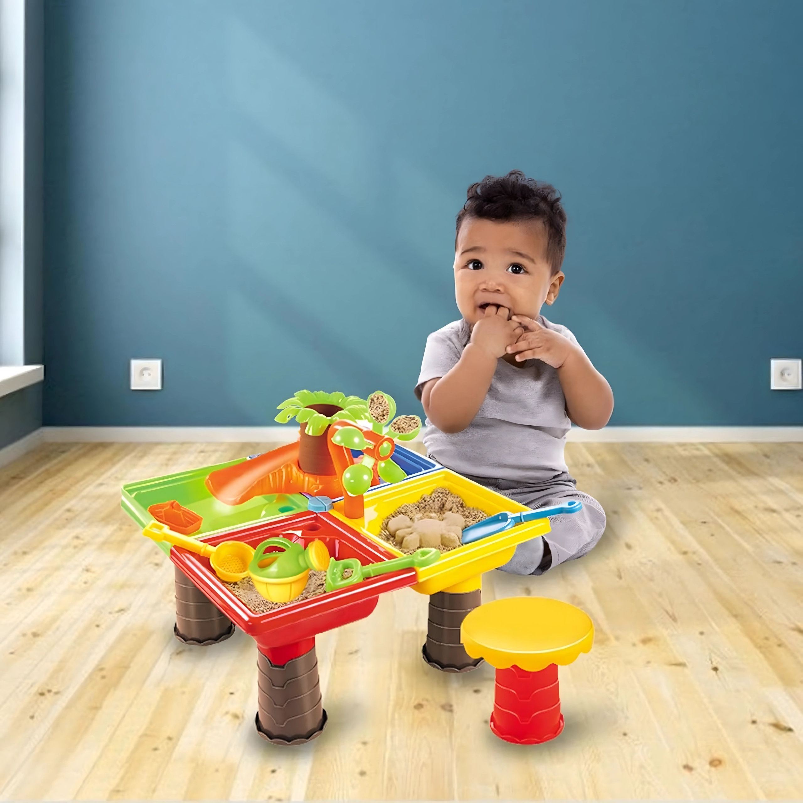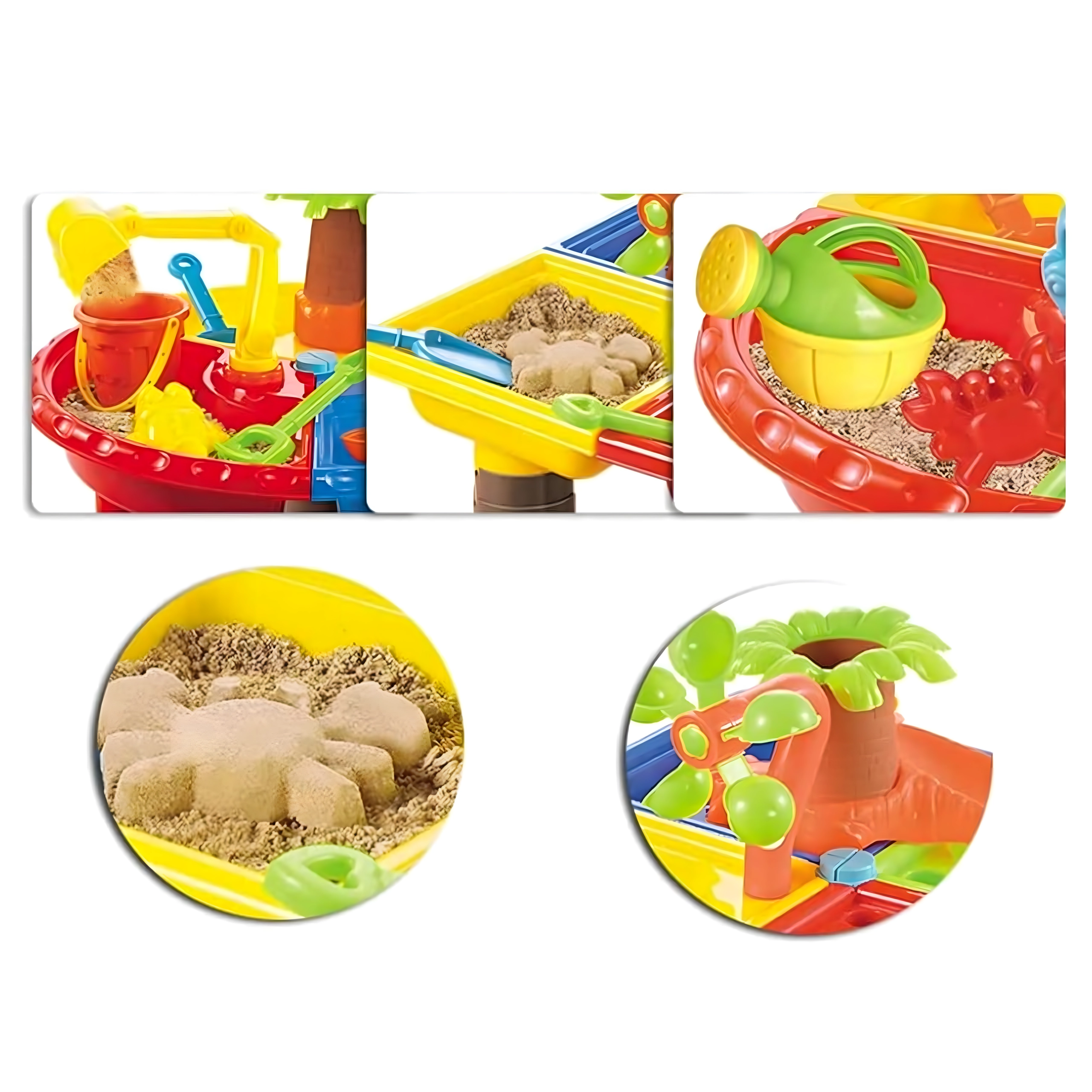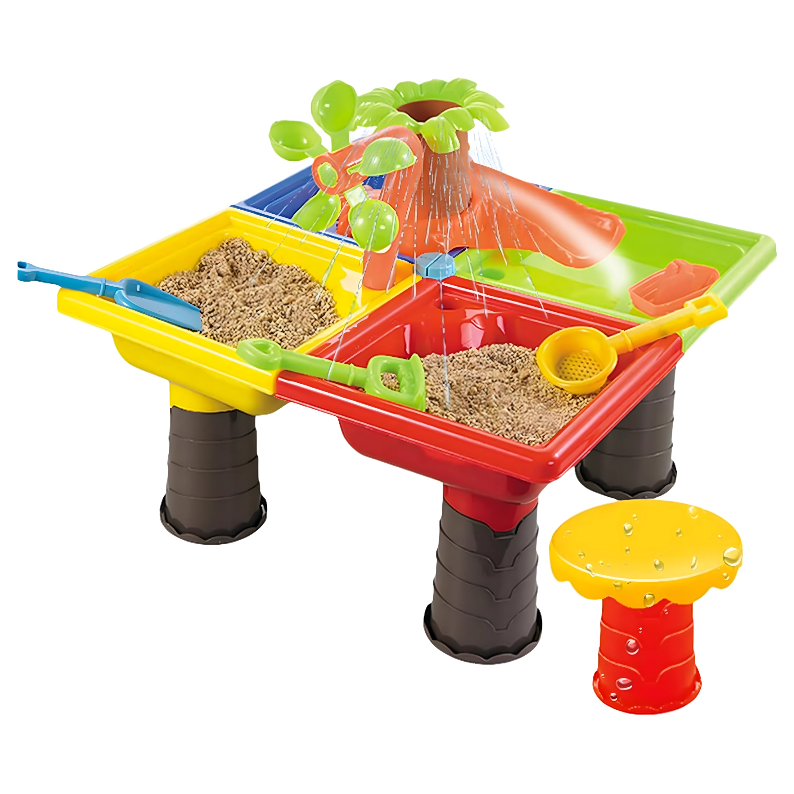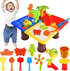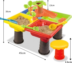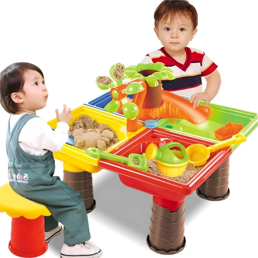 Dieser multifunktionale Wasser- und Sandtisch bietet Kindern stundenlange sensorische Unterhaltung. Vier Abteile ermöglichen die Kombination von Wasser- und Sandaktivitäten, während das zentrale Wasserelement mit „Palme“ und drehenden Rädern jedes Eingießen zum kleinen Spektakel macht. Die leichte, robuste Konstruktion ist einfach zu reinigen, und die stabilen Beine sorgen für sicheres Spielen draußen und drinnen.