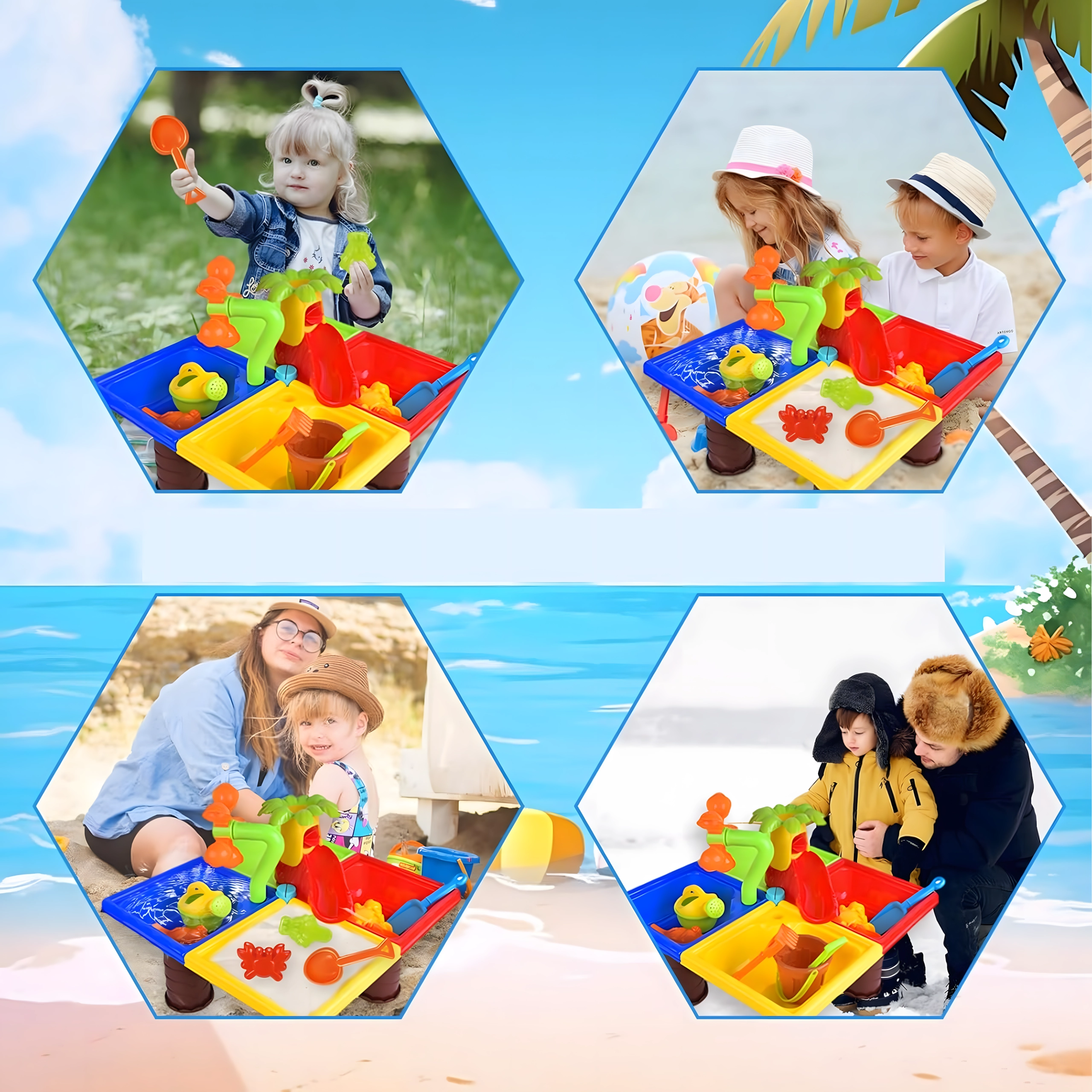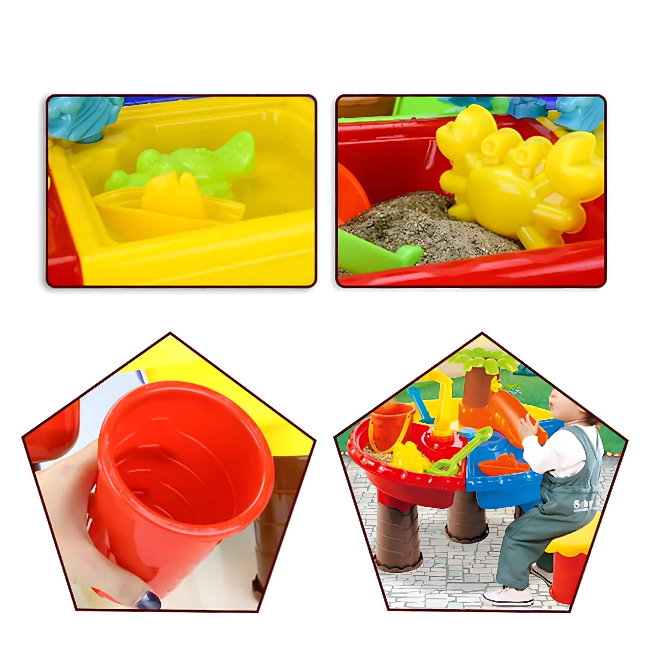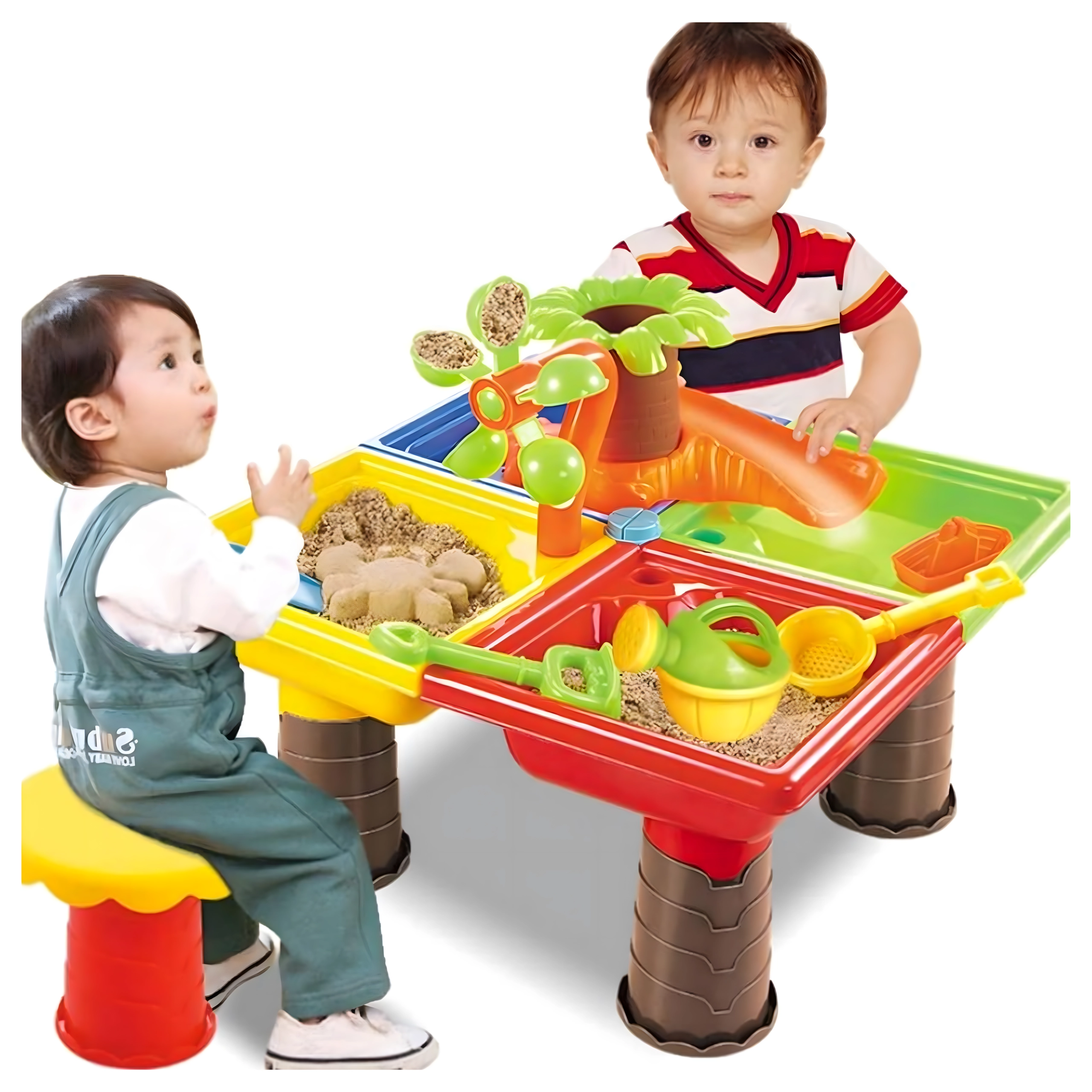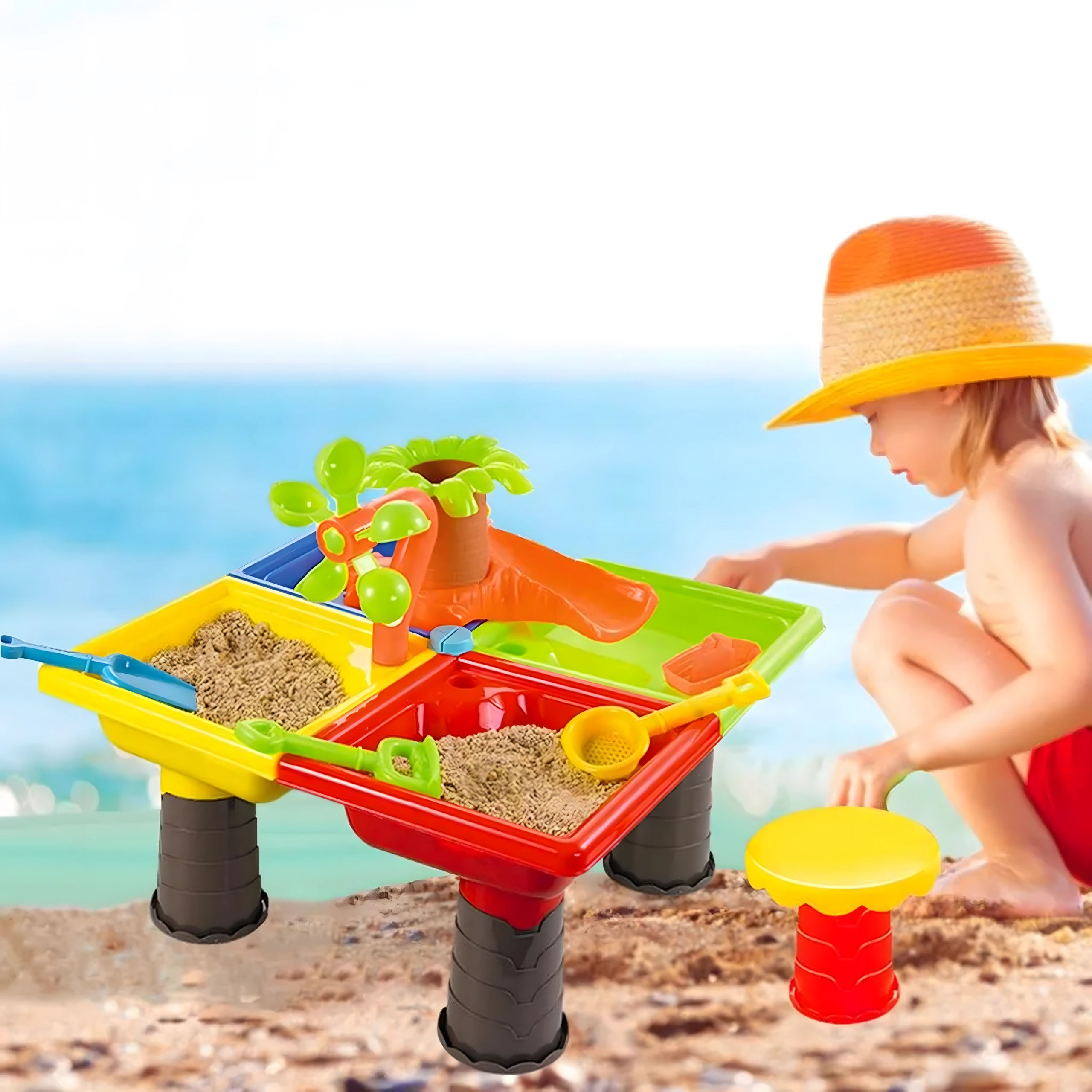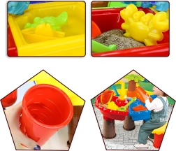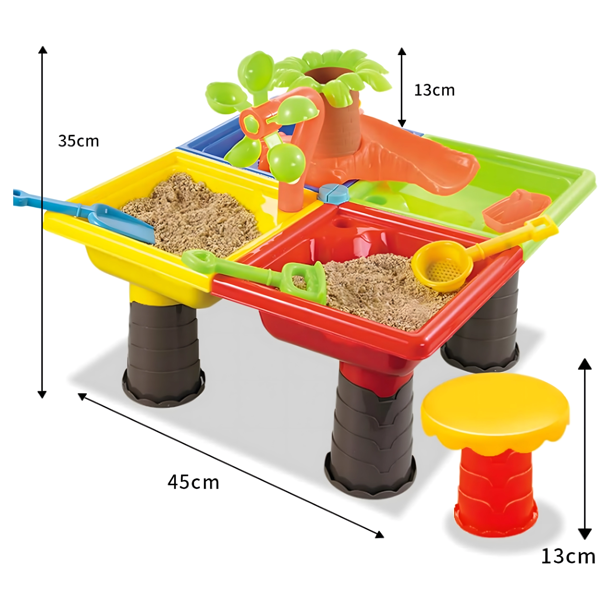 Dieser multifunktionale Wasser- und Sandtisch bietet Kindern stundenlange sensorische Unterhaltung. Vier Abteile ermöglichen die Kombination von Wasser- und Sandaktivitäten, während das zentrale Wasserelement mit „Palme“ und drehenden Rädern jedes Eingießen zum kleinen Spektakel macht. Die leichte, robuste Konstruktion ist einfach zu reinigen, und die stabilen Beine sorgen für sicheres Spielen draußen und drinnen.