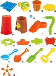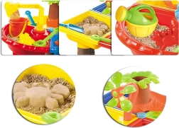 Inklusive umfangreichem Zubehör: Gießkanne, Schaufeln, Harke, Sieb, Förmchen, Becher, Rutsche und Hocker. Kinder können schöpfen, umfüllen, sieben und Formen gestalten – das fördert Feinmotorik, Hand-Auge-Koordination und Vorstellungskraft.