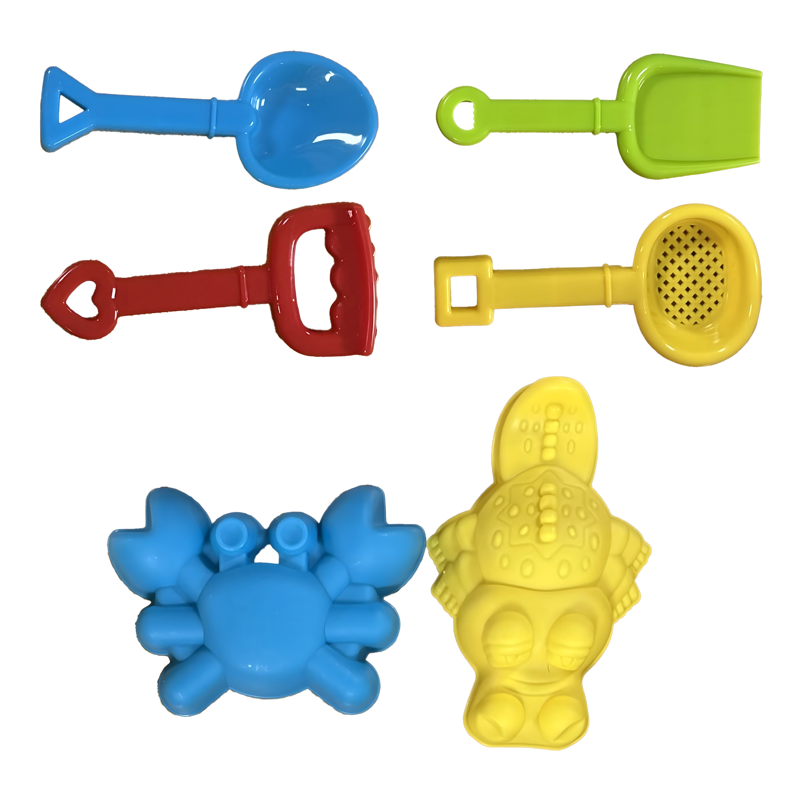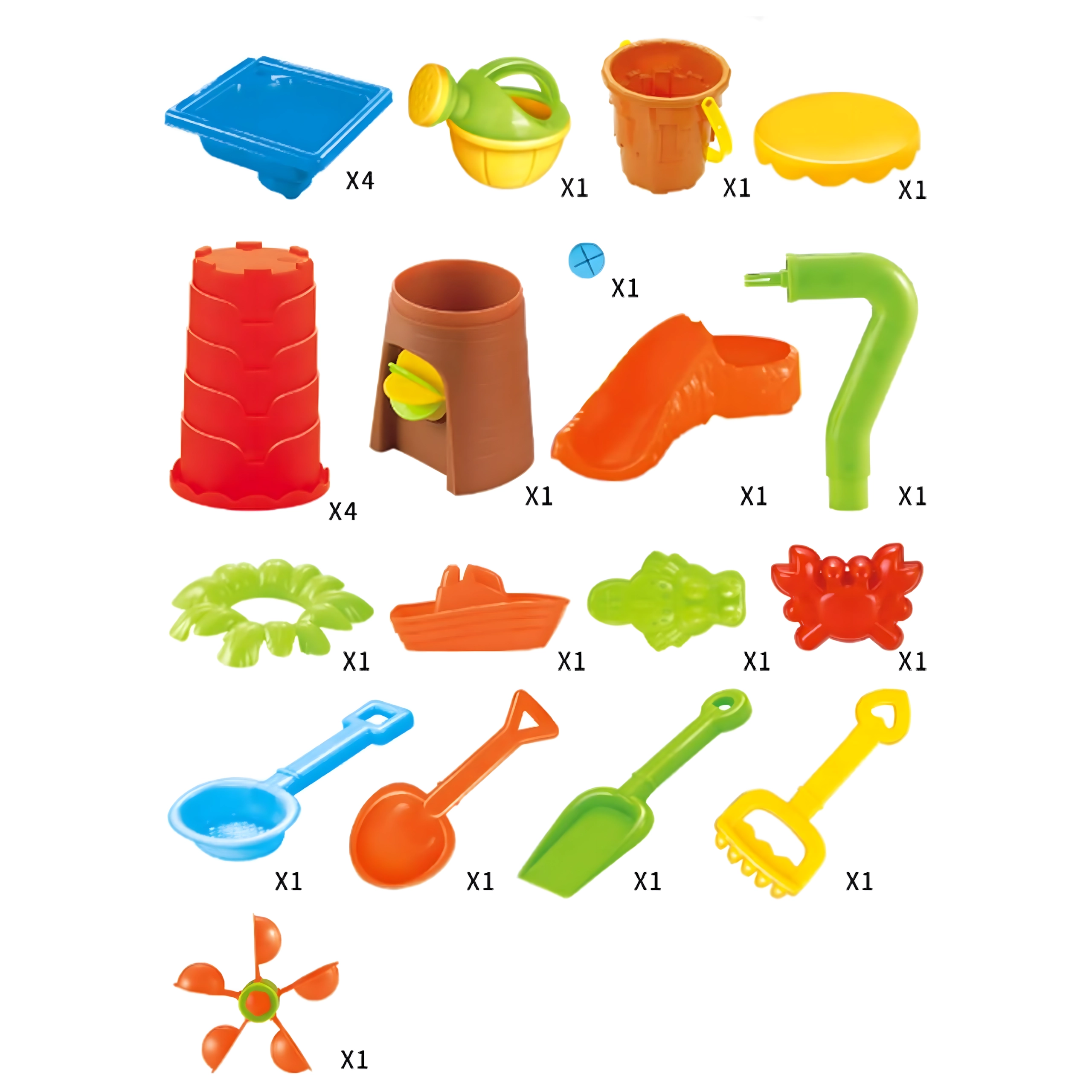 Im Set: Gießkanne, Schaufeln, Harke, Sieb, Förmchen, Becher und eine kleine Rutsche – alles griffbereit für endlose Spielvariationen.