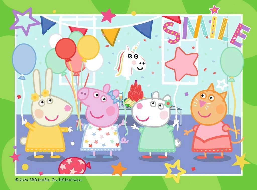 Dieses Set enthält vier einzelne Bilder mit dem Party-Thema aus der Peppa-Wutz-Welt. Durch die schrittweise Erhöhung der Teilezahl ist es ideal zur Förderung von Geduld, Feinmotorik und logischem Denken. Mit zunehmender Teilezahl verkleinert sich die Größe der Puzzleteile, was Genauigkeit und Konzentration unterstützt.