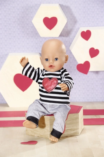 Die Dolly Moda Kleidung ist so gestaltet, dass sie sich leicht kombinieren und zwischen verschiedenen Puppen austauschen lässt. Dieser gestreifte Trainingsanzug mit Sweatshirt und Hose ist ideal für gemütliches Spielen zu Hause und stilvolle Puppenausflüge. Das markante Herz auf dem schwarz-weißen Streifenmuster und die dezenten grauen Hosen mit kontrastierenden Details verleihen dem Outfit einen modernen Look.