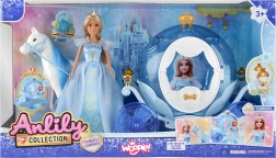 Das bezaubernde Set für kleine Märchenfans bringt alles für königlichen Spielspaß: eine Prinzessin in glitzerndem blauen Kleid mit Krone, ein majestätisches weißes Pferd und eine große Kutsche mit transparenten Elementen, die beim Spielen leuchtet. Das lange blonde Haar der Puppe und detailreiches Zubehör fördern Fantasie und das Erzählen von Geschichten.
