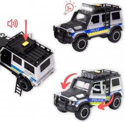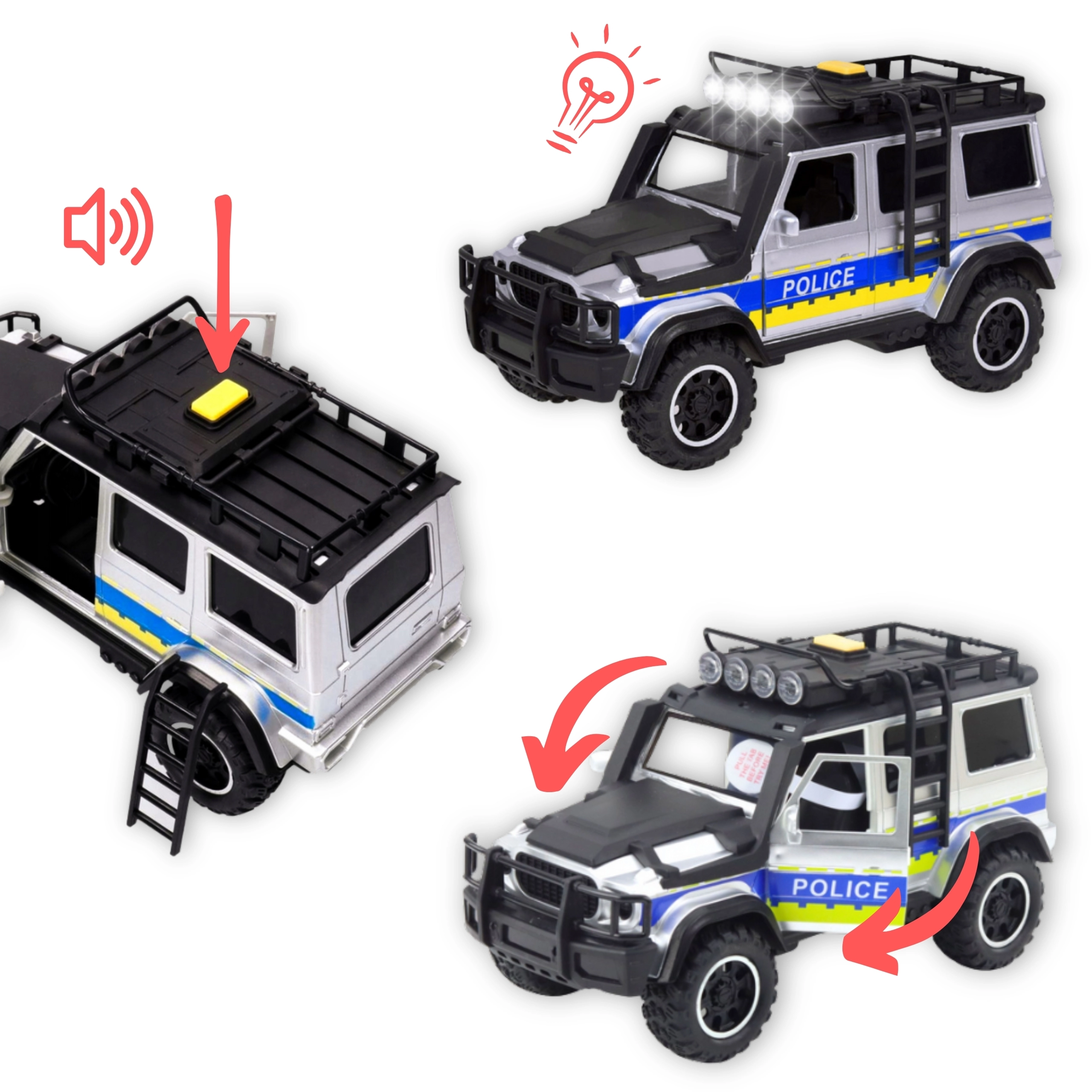 Entdecken Sie die actionreiche Welt der Polizeiarbeit mit einem realistischen Set, das einen robusten Geländewagen und einen Anhänger für den Pferdetransport kombiniert. Dank Licht- und Soundeffekten wirkt das Spiel authentisch und Kinder können leicht eigene Geschichten erfinden. Öffnende Türen und ein abnehmbarer Anhänger fördern Fantasie und Feinmotorik.