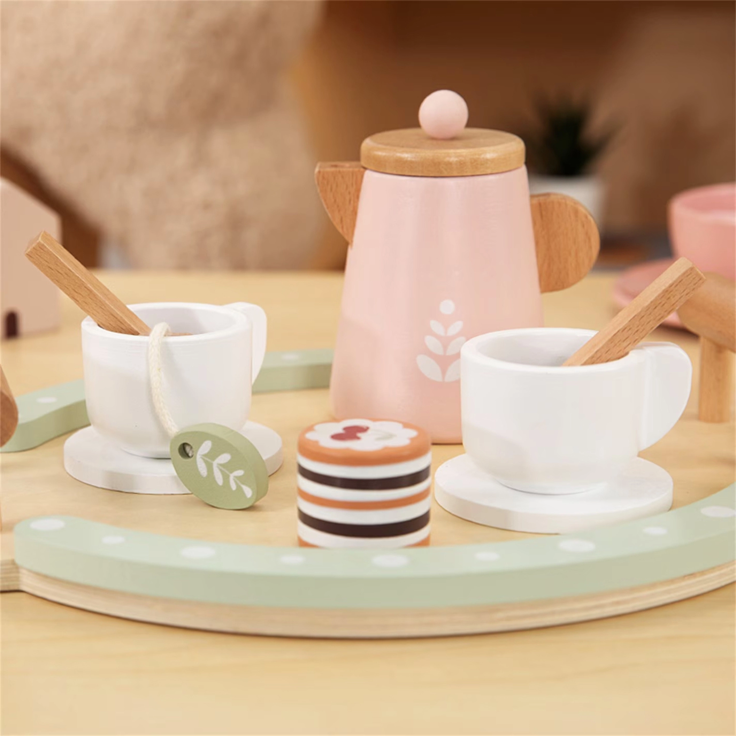 Das WOOPIE GREEN Tee- und Kaffeeset aus Holz verwandelt jeden Tag in ein zauberhaftes Teezeremoniell. Zeitloses Design in sanften Farben, glatte Oberflächen und angenehme Formen sind ideal für kleine Hände. Kinder können Tee aus dem Kännchen servieren, Küchlein und Kekse anbieten und beim gemeinsamen Spiel soziale Fähigkeiten entwickeln.