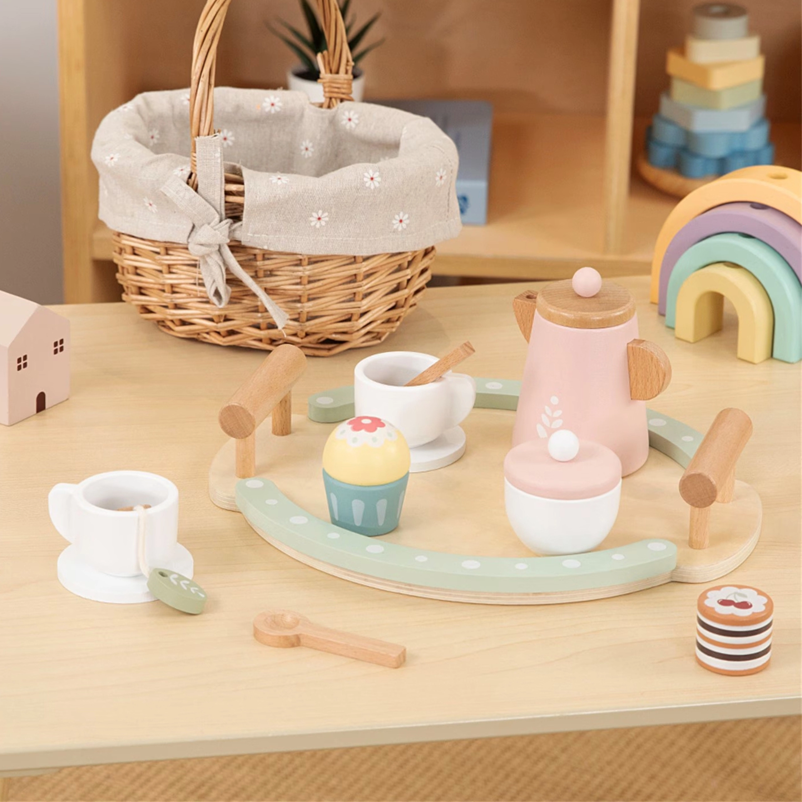 Alles, was kleine Gastgeberinnen und Gastgeber brauchen: Kännchen, Tassen, Löffel, Zuckerdose, Desserts sowie ein Tablett mit Griffen für einfaches Servieren.