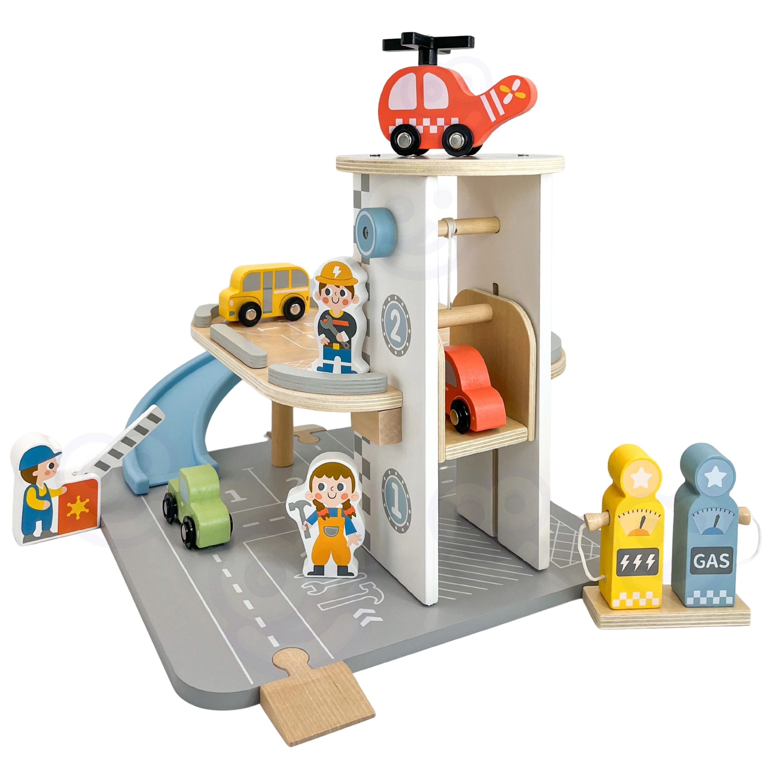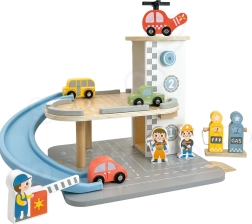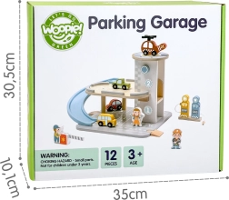 Das hölzerne 2-in-1-Parkhaus kombiniert eine Garage auf zwei Ebenen und eine Tankstelle, damit Kinder Fahren, Parken und Tanken nachspielen können. Die Autos sausen die blaue Spiralrampe hinunter, der Hubschrauber mit drehendem Rotor landet auf dem Dachheliport und das Servicepersonal kümmert sich um den Betrieb. Hochwertige Verarbeitung aus Holz und eine stabile Basis gewährleisten sicheres Spielen ab 3 Jahren.