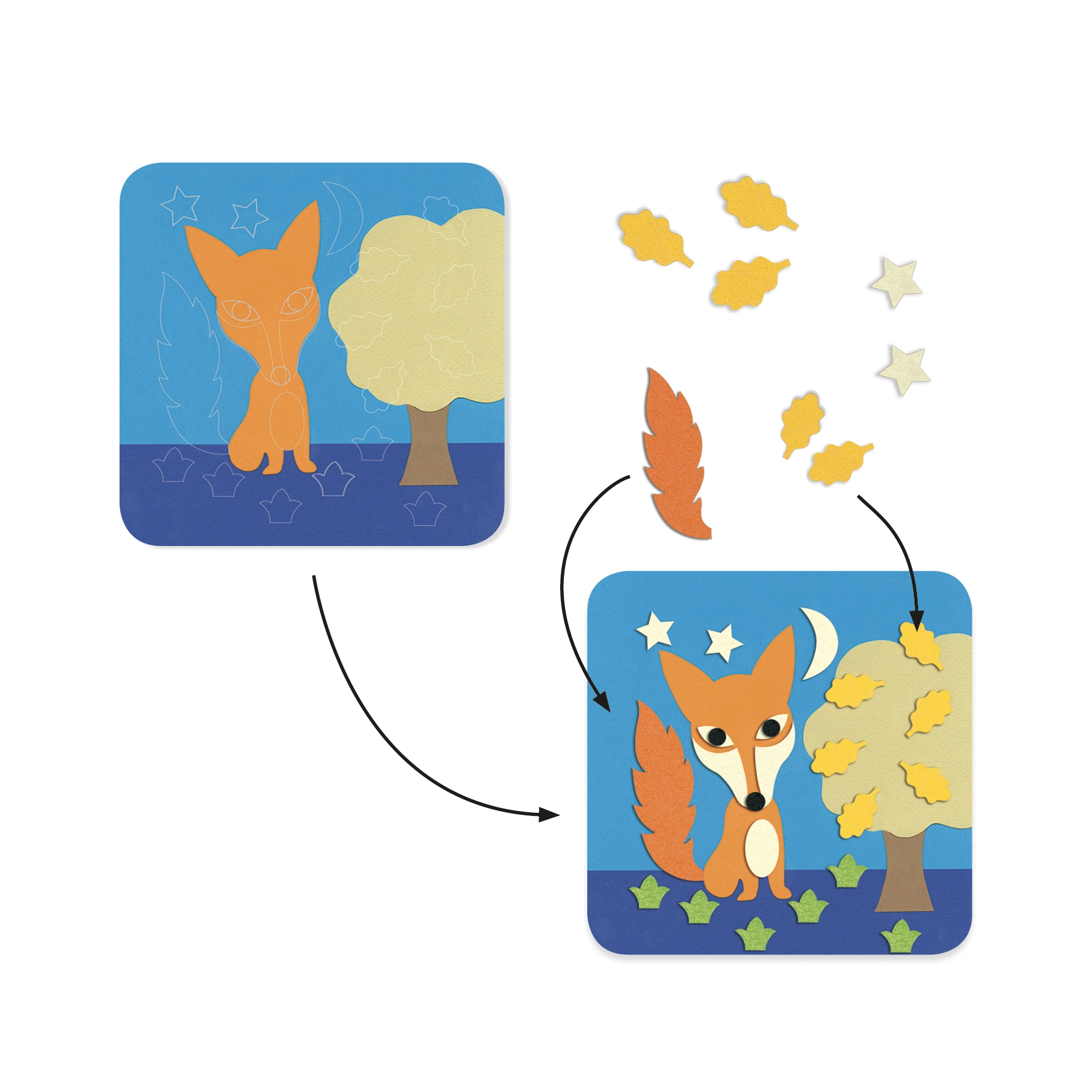Entdecken Sie den Zauber des Bastelns mit Filz. Das Set Filz-Collagen Süße Natur von DJECO ermöglicht es Kindern, farbenfrohe Szenen mit Tieren mithilfe vorbereiteter Vorlagen und weicher Filzteile zu gestalten. Dank klarer Anleitungen ist das Basteln intuitiv und die Ergebnisse sehen großartig aus.