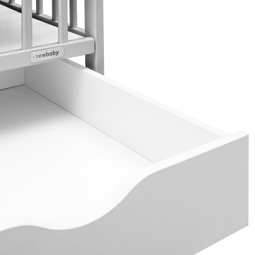 Die integrierte Aufbewahrungsschublade lässt sich sanft herausziehen, berührt nicht den Boden und hält alles Nötige griffbereit – von Windeln bis Bettwäsche.