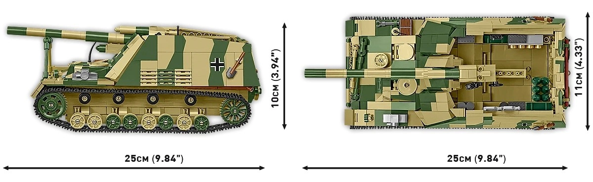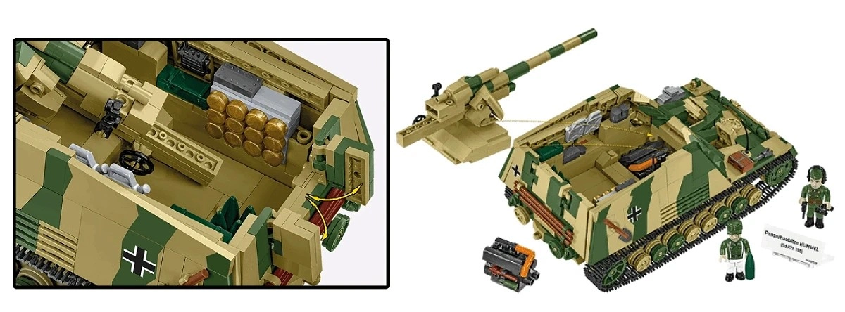Die authentische Replik der deutschen Selbstfahrlafette Panzerhaubitze HUMMEL entsteht aus 1118 hochwertigen COBI-Teilen im Maßstab 1:28. Dank realistischer Proportionen, offenem Kampfraum, langem Rohr und detailgetreu ausgearbeitetem Fahrwerk mit Ketten erhalten Sie ein beeindruckendes Modell für Vitrine und Spiel. Ebenfalls enthalten sind ein separat ausstellbarer Maybach HL120 TRM Motor und die Möglichkeit, die 15-cm-Haubitze sFH 18 (L/30) auszubauen.