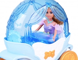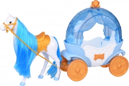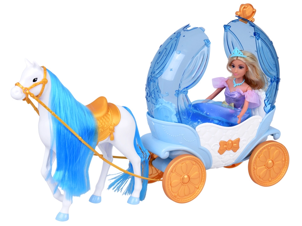 Die „Kürbis“-Kutsche in Blau‑Weiß mit goldenen Akzenten hat eine öffnende obere Abdeckung, sodass die Puppe leicht hineingesetzt werden kann. Das weiße Pferd mit blauer Mähne ist mit Sattel, Zaumzeug und Geschirr ausgestattet, die Kutsche hat bewegliche Räder für eine sanfte Fahrt über den Boden.