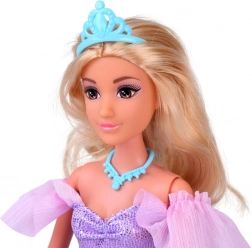 Die Puppe hat langes blondes Haar, ein türkisfarbenes Diadem und eine Halskette. Kleider in Blau‑Lila‑Tönen mit goldener Schleife und Schneemotiven verleihen jedem Ball einen Hauch von Magie.