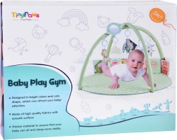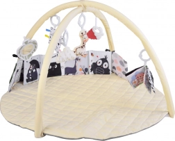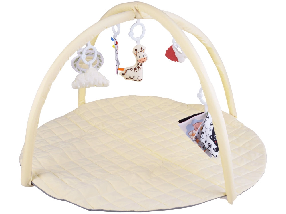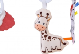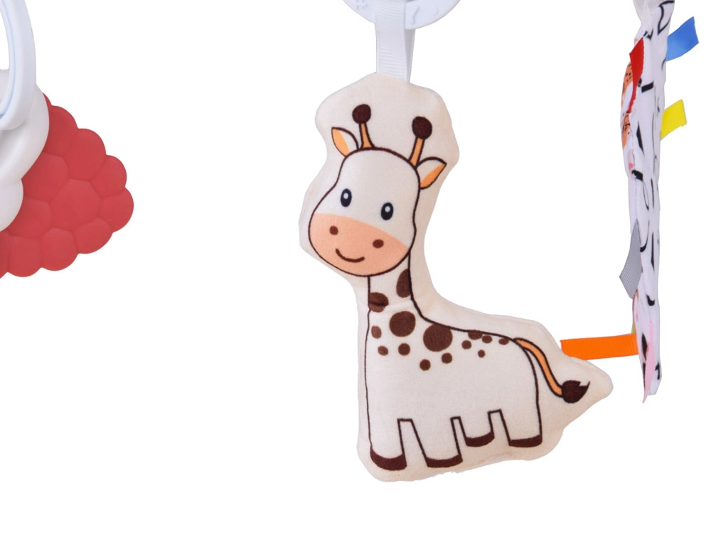 Die zwei flexiblen Bögen lassen sich leicht abnehmen zum Waschen oder für Reisen. An den Ringen hängen verschiedene Spielzeuge, die Sehen, Hören und Tasten fördern: eine Plüsch-Giraffe, ein weiches Minky-Wölkchen, ein sicheres Spiegelchen, ein kontrastreiches beidseitiges Büchlein, ein knisterndes Quadrat mit Labels sowie ein Beißring. Kontrastreiche Motive und unterschiedliche Texturen unterstützen Konzentration und Hand-Auge-Koordination.
