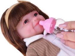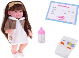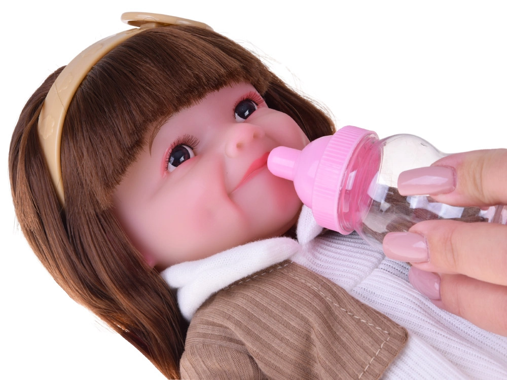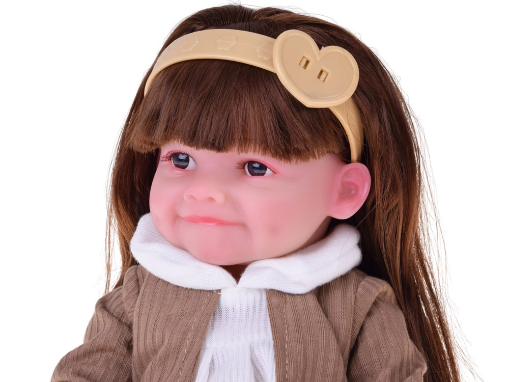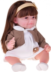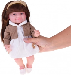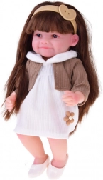 Die Puppe Tosia mit sanftem Lächeln und langen braunen Haaren erfreut jedes Kind. Sie hat einen weichen, angenehm zu berührenden Körper, bewegliche Gliedmaßen und kann selbstständig sitzen. Enthalten sind eine Fläschchen-Zubehör, eine Windel und eine Geburtsurkunde für realistisches Pflegespiel. Das stylische Outfit besteht aus einem weißen Kleid, einem beigen Cardigan, einem Haarband und abnehmbaren Ballerinas.