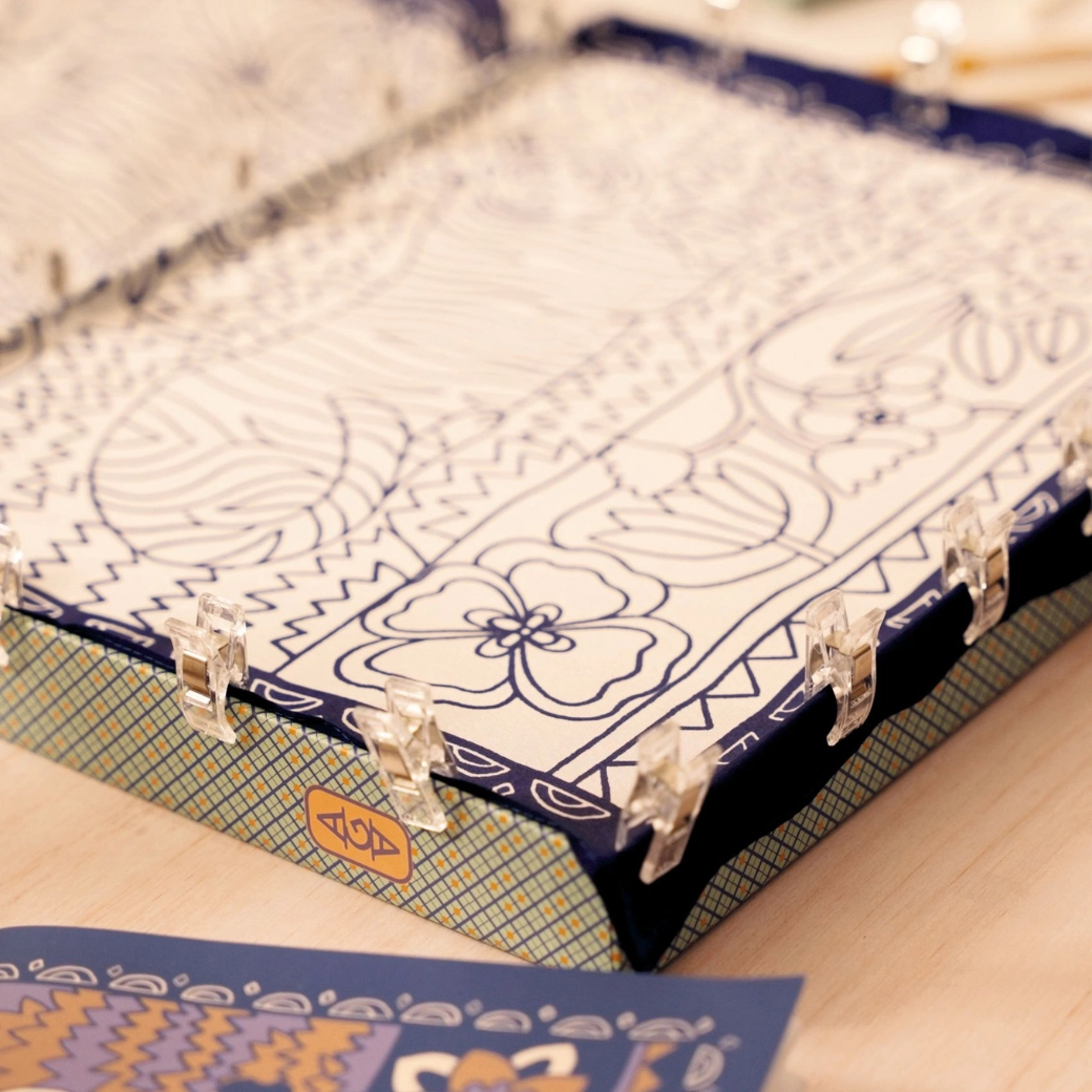 In der Box finden Sie ein Seidentuch mit Motiv, ein Set Textilfarben, Pinsel, Klammern und praktische Organizer. Einfach auspacken und loslegen.