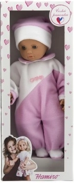 Ein niedliches Baby mit einer Länge von 50 cm erfreut jede kleine Mama. Es hat einen kuschelweichen Stoffkörper für angenehmes Schmusen und ist in einen rosa-weißen Overall gekleidet. Ideal für Rollenspiele rund um die Pflege und zur Förderung der Fantasie sowie der Feinmotorik.