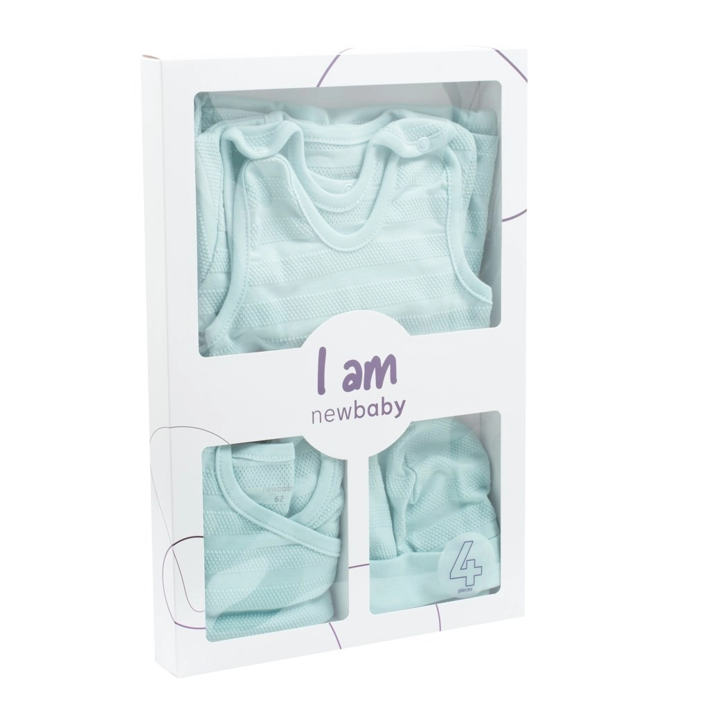 Im Set enthalten sind ein Wickel-Body mit langen Ärmeln, ein Strampler mit geschlossenen Füßchen, ein Jäckchen mit Knopfleiste sowie ein Mützchen mit breiterem Umschlag, das sicher auf dem Köpfchen sitzt, ohne zu drücken. Die gesamte Kollektion hat ein dezentes strukturiertes Muster und kommt in einer ökologischen Geschenkbox – perfekt als Geschenk für frischgebackene Eltern.