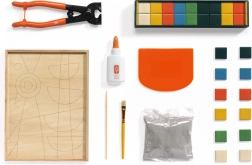 Bunte Mosaikfliesen, Kleber mit Applikator, Mischpulver/Fugenmasse, Spachtel, Pinsel, Holzbasis/Rahmen, Stäbchen zum Platzieren der Teile, Zange zum Anpassen der Stücke