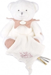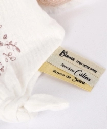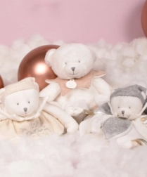 Das Design wird durch eine feine Doudou-Stickerei und satinierte Bändchen mit liebevollen französischen Botschaften veredelt, die dem Set einen eleganten und liebevollen Charakter verleihen. Der Bär hat ein rosa Herzchen auf der Pfote, einen Kragen am Hals und superweiche Pfötchen – ein tolles Geschenk für Neugeborene.