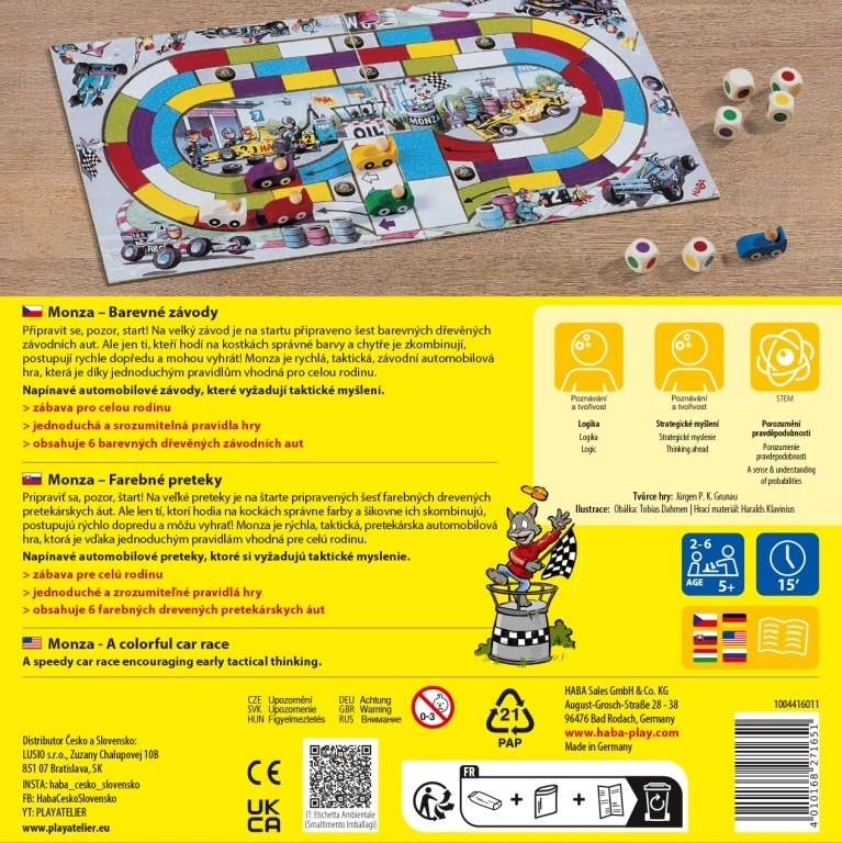 Betritt die Rennstrecke und überhole die Gegner durch eine clevere Wahl der Farbwürfel. Monza kombiniert einfache Regeln mit taktischen Entscheidungen – so hat die ganze Familie Spaß. Die kurze Spieldauer und das flotte Tempo laden zu wiederholtem Spielen ein.