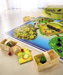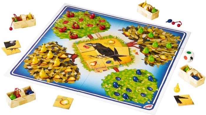 Obstgarten ist ein beliebtes kooperatives Kinderspiel, in dem Kinder gemeinsam Kirschen, Äpfel, Birnen und Pflaumen aus dem Garten sammeln. Jeder Zug zählt – schafft ihr es, schneller zu sein als der schlaue Rabe? Dank einfacher Regeln steigen auch die Jüngsten sofort ein und lernen, zusammenzuarbeiten, sich abzusprechen und zu planen.