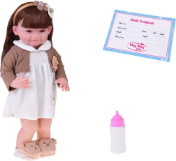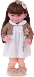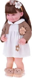 Diese wunderschöne Puppe trägt ein weißes Kleid mit Blumenapplikation und einen braunen Cardigan mit Schleife. Das Outfit wird durch weiche Hausschuhe in Bärenform und einen beigen Haarreif mit Deko ergänzt – für einen zarten, kindlich süßen Look. Dank des realistischen Gesichts und der langen Haare genießen Kinder stundenlangen kreativen Spielspaß.