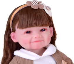 Die Puppe überzeugt mit fein ausgearbeiteten Gesichtszügen, großen braunen Augen mit dichten Wimpern und einem Lächeln mit Grübchen – natürlich und herzlich.