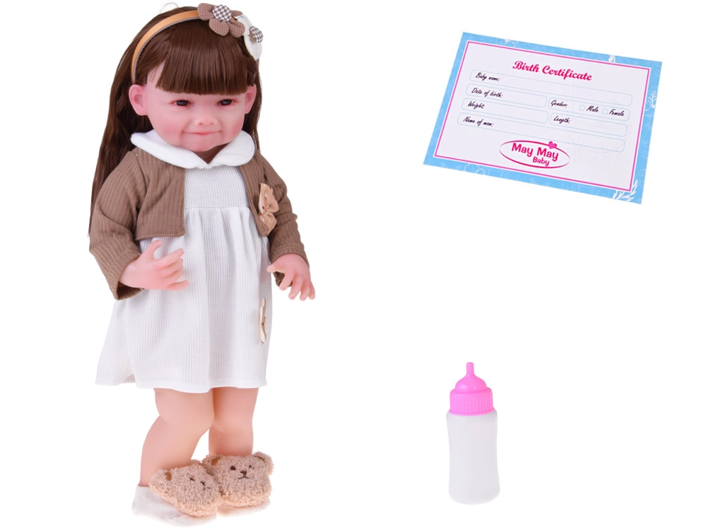 Die niedliche Puppe May May Baby 55 cm begeistert mit realistischen Details, langen braunen Haaren zum Kämmen und Stylen sowie beweglichen Gliedmaßen für leichtes Posieren. Sie hat einen weichen, sanften Körper zum Kuscheln, große braune Augen mit dichten Wimpern und ein Lächeln mit Grübchen. Inklusive Fläschchen und Geburtsurkunde – ideal für Rollenspiele als Eltern.