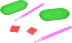 Zwei Rillen-Schälchen, zwei Applikationsstifte und zwei Wachse sorgen für präzises und komfortables Setzen der Steinchen – ideal für Kinder und Einsteiger.