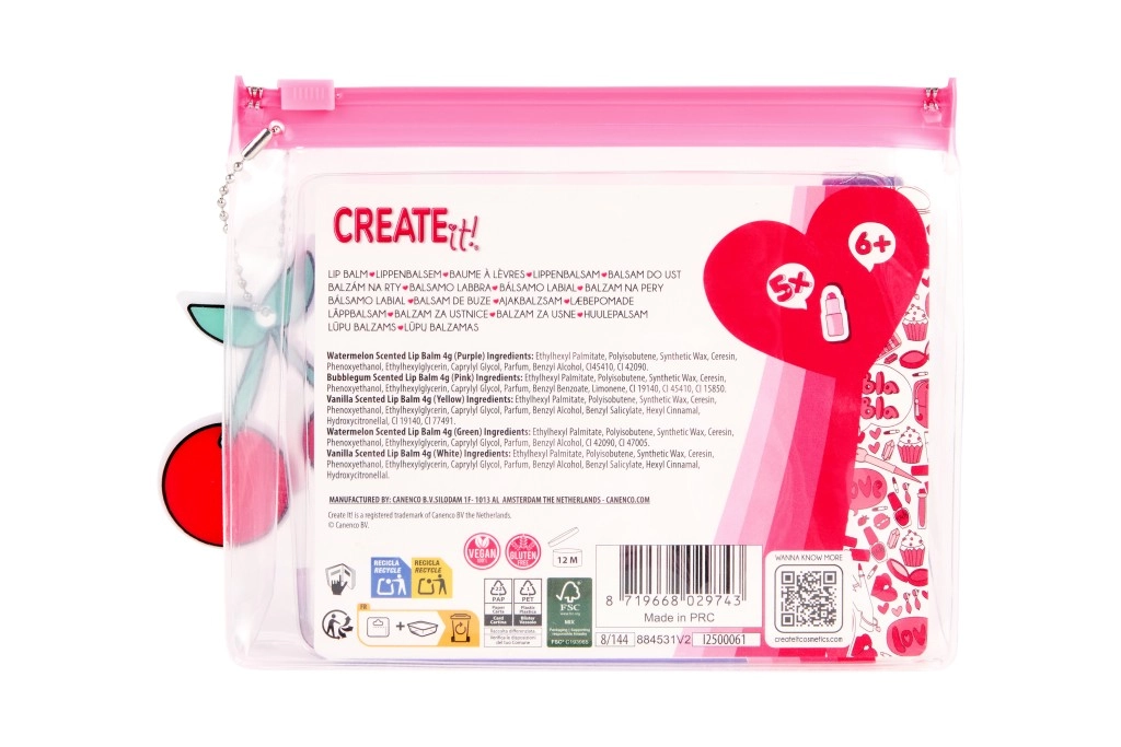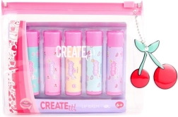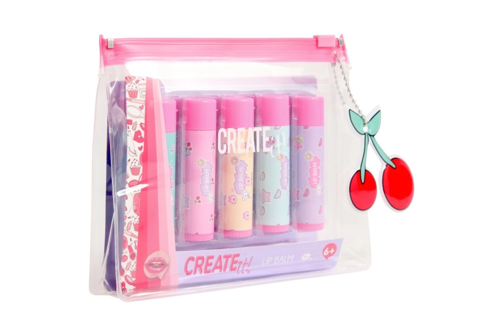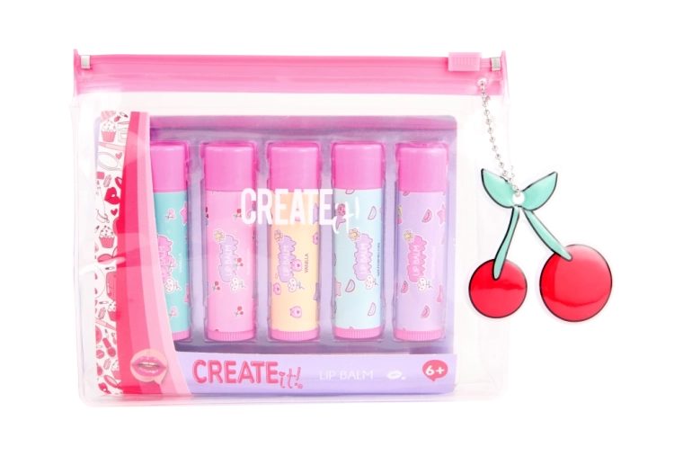 Das CREATE IT! Set bringt fünf verspielte Lippenbalsame in Pastelltönen, die die Lippen den ganzen Tag pflegen. Dank des praktischen transparenten Etuis mit rosa Reißverschluss hast du alle Balsame ordentlich beisammen – zu Hause, in der Schule und auf Reisen.