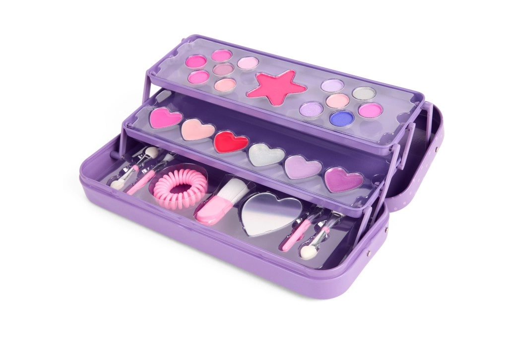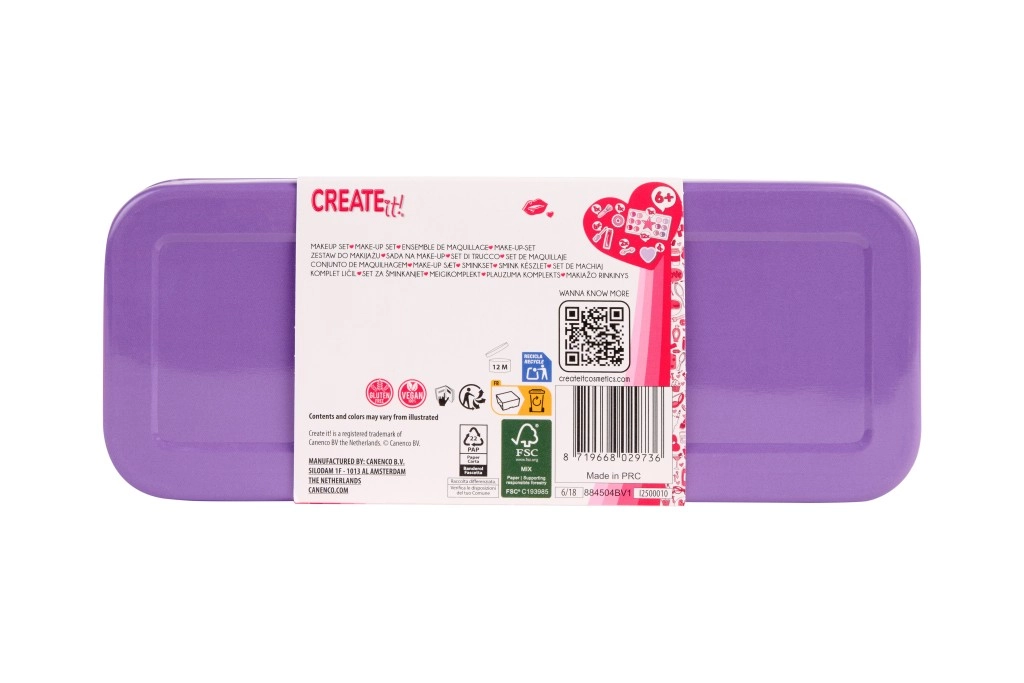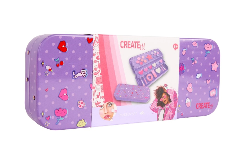 Diese ausklappbare Kassette CREATE IT! bietet alles, was Kinder für sicheres und fröhliches Verschönern brauchen. Drei Ebenen verbergen 10 Lidschatten, Rouge, 6 Lipglosse, Pinsel, einen niedlichen herzförmigen Spiegel sowie ein praktisches Haargummi. Dank des stabilen Metallgehäuses ist das Set ideal für unterwegs und hält häufiges Öffnen gut aus.