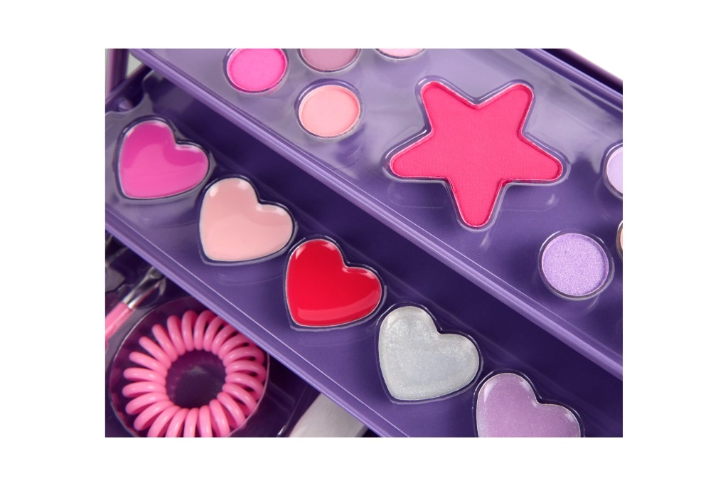10 Lidschatten, Rouge, 6 Lipglosse, 3 Pinselarten, ein herzförmiger Spiegel und ein Haargummi für ein komplettes Make-up-Erlebnis.