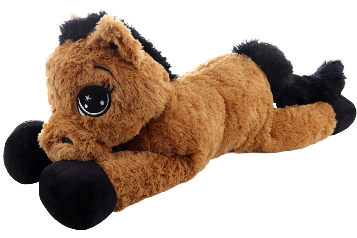 Dieses braune liegende Plüschpferd begeistert auf den ersten Griff. Es hat große gestickte Augen, eine weiche Mähne und einen weichen Schweif und dient sowohl als kuscheliger Freund als auch als bequeme Stütze beim Lesen oder beim Anschauen von Märchen. Die Maße 80 × 32 × 25 cm garantieren ausreichend Platz zum Umarmen und Ausruhen.