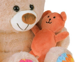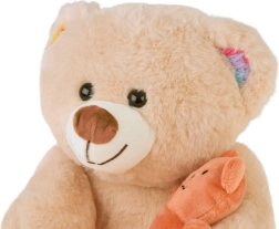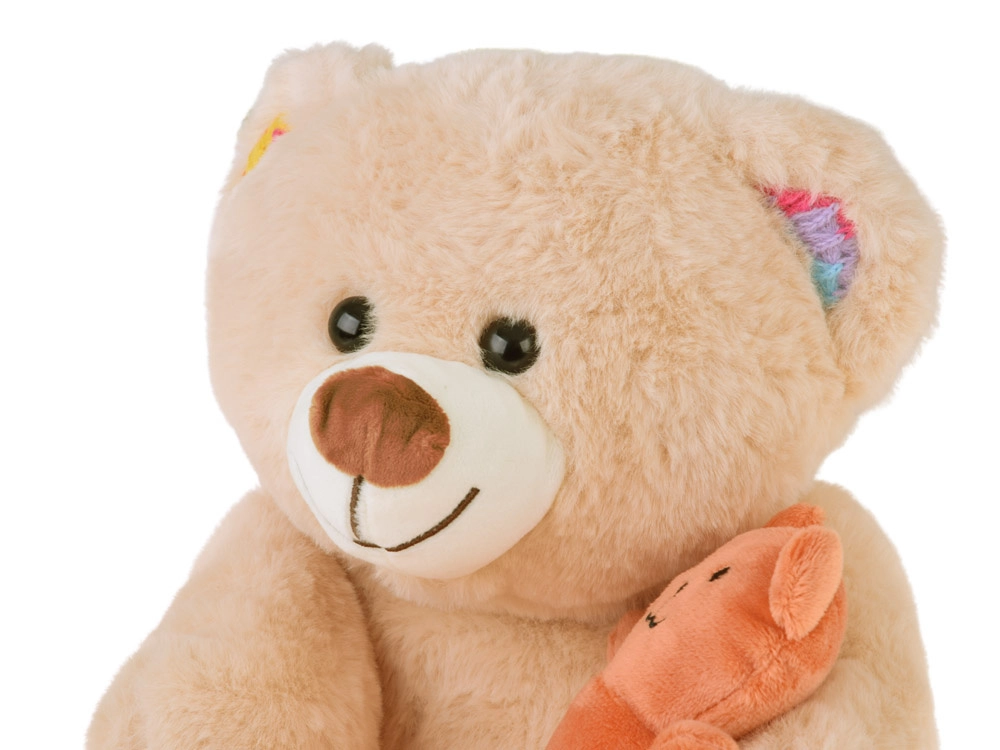 Ein beigefarbener Plüschbär mit gesticktem Lächeln hält einen kleinen orangefarbenen Bären – ein entzückendes Duo, das Kinder sofort ins Herz schließen.