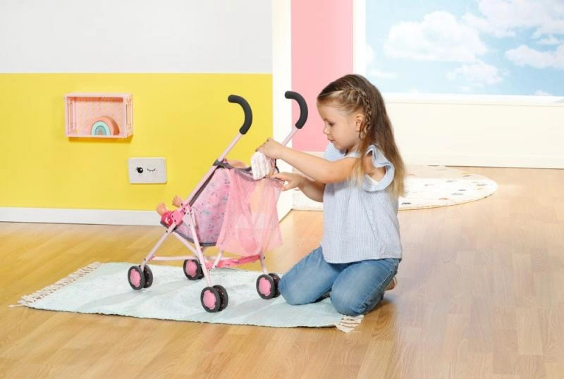 Der BABY born Puppenwagen ist ideal für tägliche Spaziergänge und das Spielen zu Hause. Der leichte Metallrahmen, bequeme Schaumstoffgriffe und vier Doppelräder ermöglichen eine mühelose Handhabung selbst für kleine Kinderhände. Der Sitz mit fröhlichem Druck ist mit Sicherheitsgurten ausgestattet, die die Puppe zuverlässig fixieren.